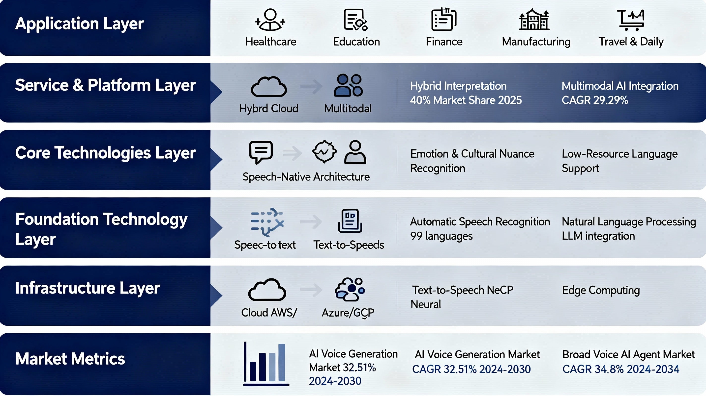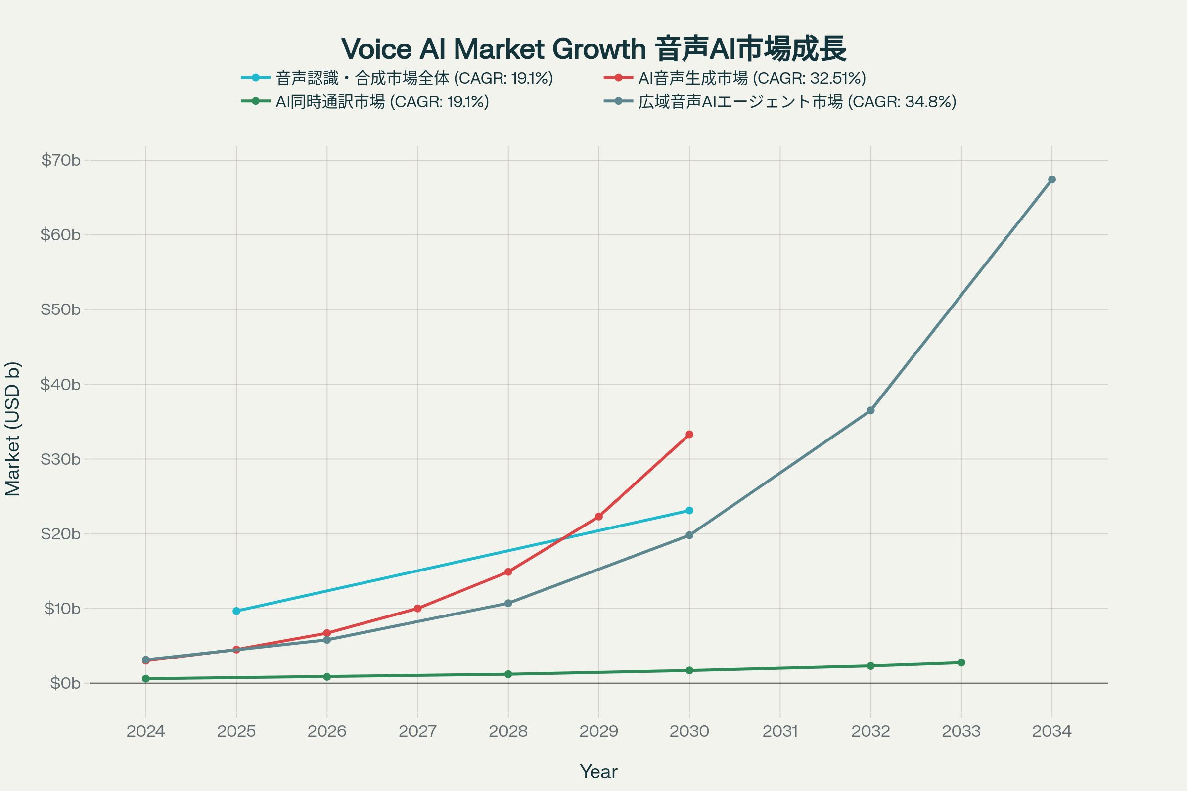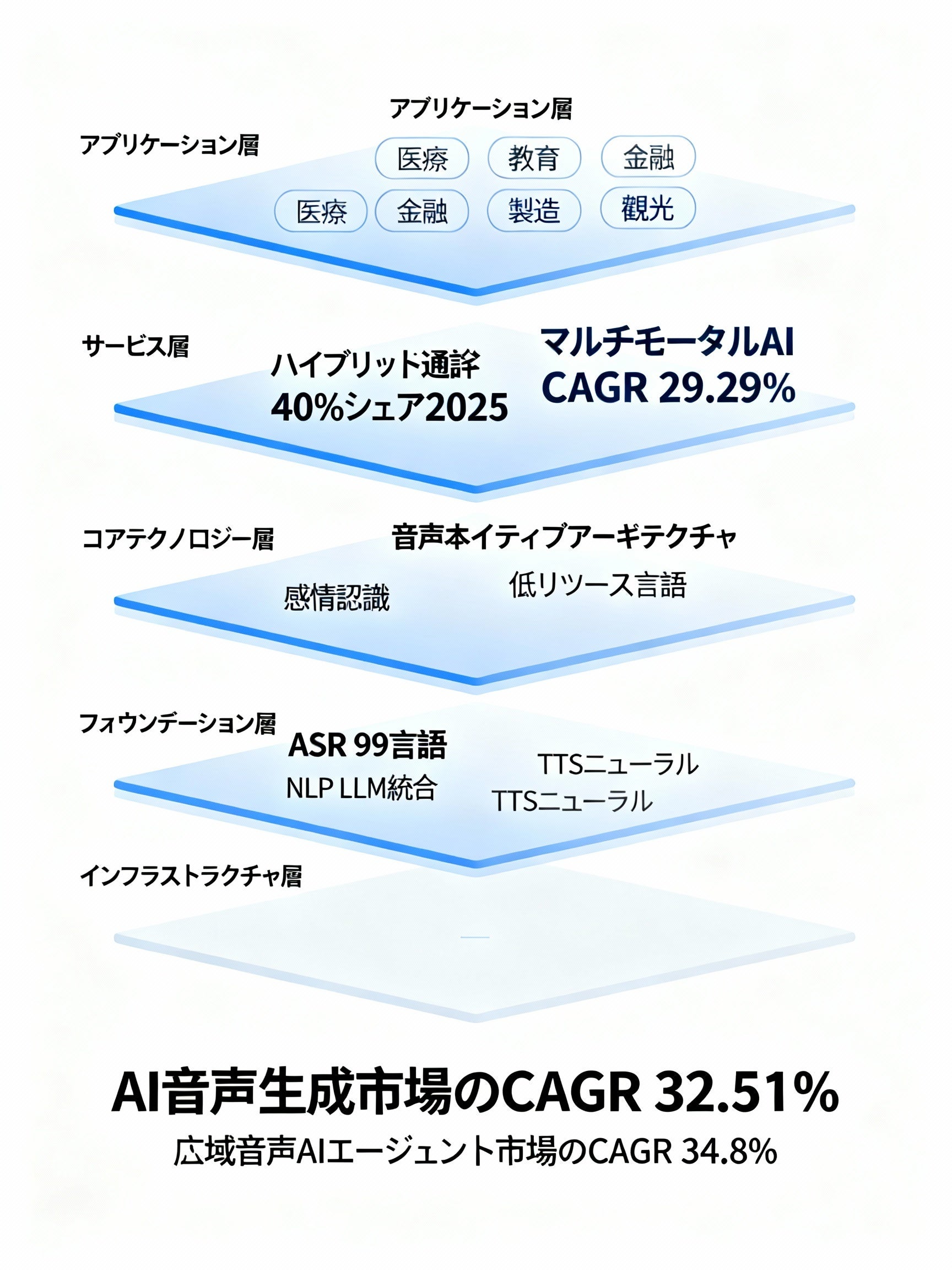 音声認識・音声合成技術は2025年の96.6億米ドルから2030年に231.1億米ドルへ成長し、年平均成長率19.1%を記録する見通しである。特にAI音声生成市場は32.51% CAGRで拡大し、2024年の30億米ドルから2030年に204億米ドルに達することが見込まれている。技術的には、スピーチネイティブアーキテクチャ、スピーチ基盤モデル(SLM)、エンドツーエンド音声-音声変換により、従来のカスケード方式を超える自然度と低遅延を実現している。
