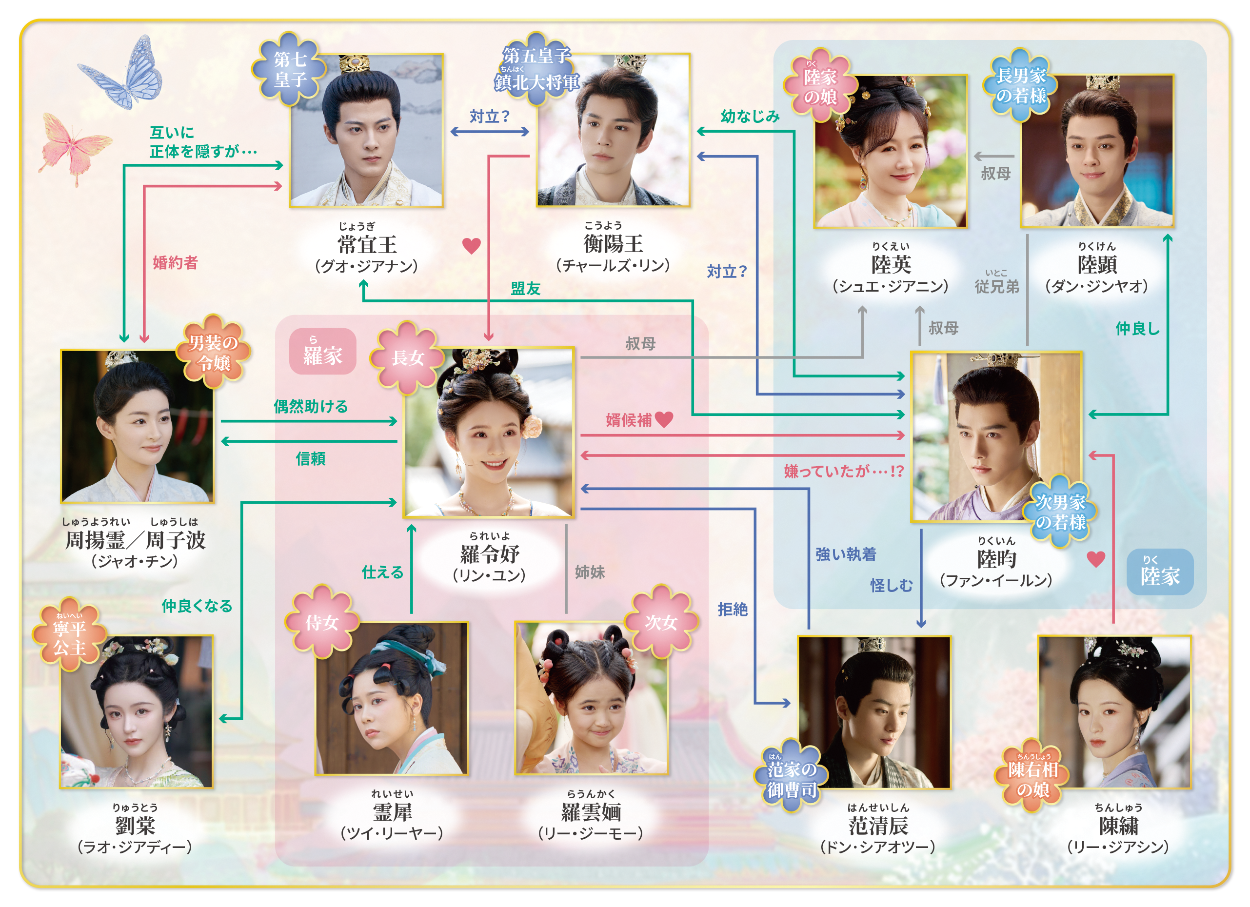 羅令妤に恋をする強く頼もしい第五皇子の衡陽(こうよう)王役は、「蒼蘭訣~エターナル・ラブ~」などに出演する実力派イケメン俳優チャールズ・リンが熱演! 羅令妤の行方を追い執着する御曹司・范清辰(はんせいしん)役にはIXFORMの元メンバーで、美しいビジュアルに定評があるドン・シアオツー。そして、陸昀の盟友で誠実な第七皇子・常宜(じょうぎ)王役は、「古相思曲~君想う、千年の調べ~」で主演を務めたグオ・ジアナン。陸昀の心優しい従兄弟(いとこ)・陸顕(りくけん)役を「ラブ・ヒーロー~私のカレはイケメン消防士~」などに出演する若手俳優ダン・ジンヤオが爽やかに演じている! さらに、羅令妤を手助けする男装の令嬢・周揚霊(しゅうようれい)役を「墨雨雲間(ぼくううんかん)~美しき復讐~」のジャオ・チン。「星漢燦爛<せいかんさんらん>」でヒロインの子供時代を演じた子役のリー・ジーモーや、「安寧録~海棠に降る光~」リー・ジアシン、「永夜星河(えいやせいが)~シークレット・ラブミッション~」ラオ・ジアディーなど次世代美人女優たちも多数出演し、明るく楽しいロマンスに彩りを添えている!