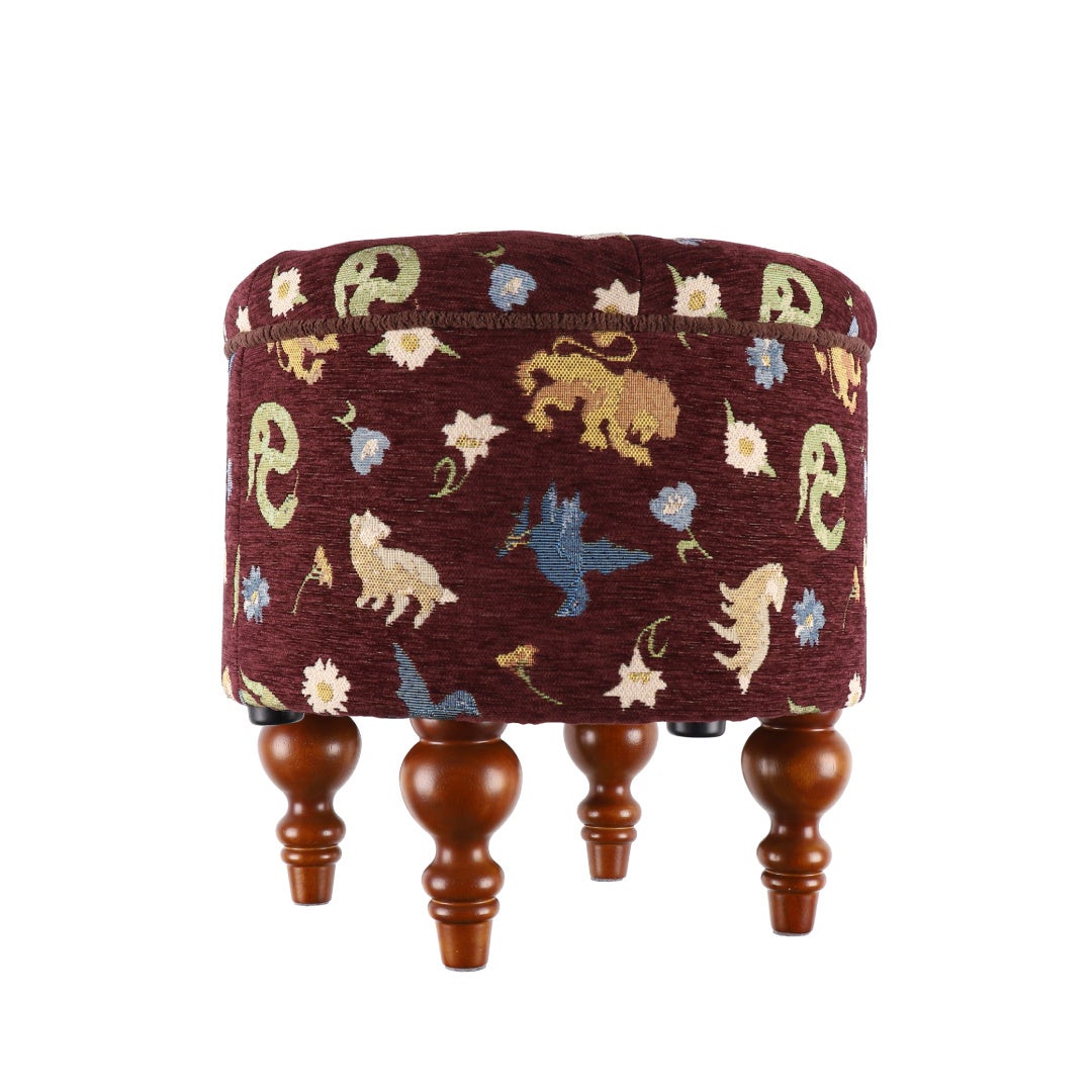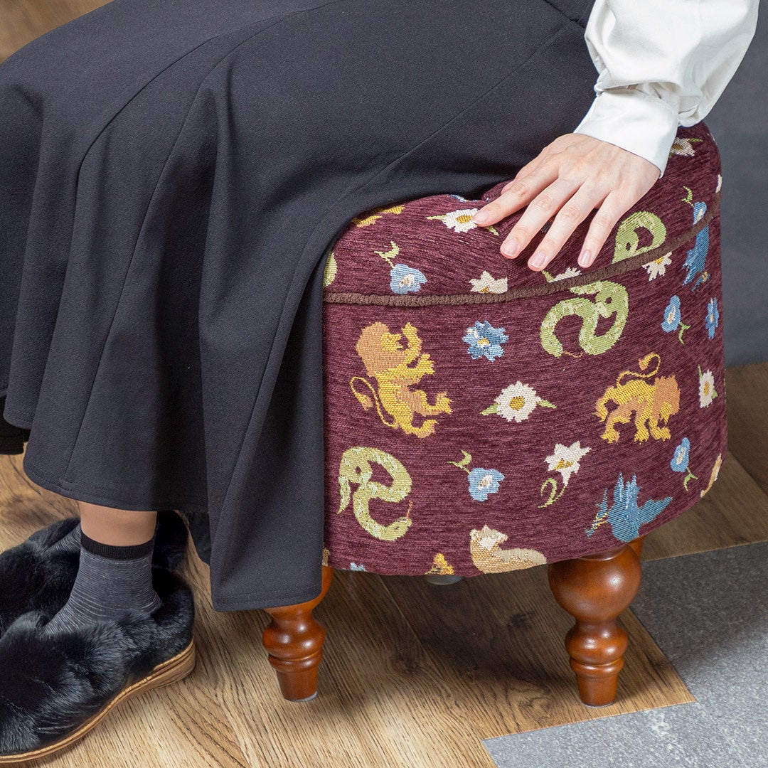 高級感とあたたかみを感じられるジャカード生地を採用し、落ち着いた濃紫のカラーがエレガントな印象のスツールです。曲線の美しい木製の脚は工具不要で取り付け可能なねじ込み式で、スツールだけでなくオットマン、サイドテーブルなど用途に合わせて高さの調節が可能。シックでありながらも個性的なデザインは、お部屋のアクセントとしてもぴったりです。リビングや寝室などお家のさまざまな場所で活躍します。
