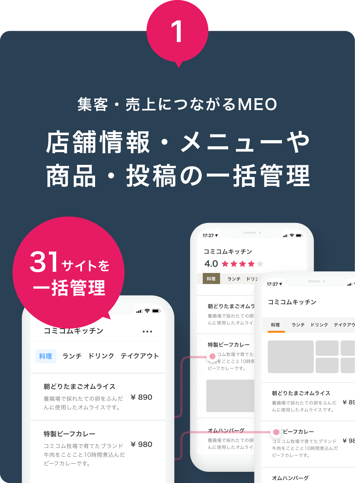 口コミコムは、国内外の口コミサイトを”もっと”売上に変える「店舗向け集客一元化プラットフォーム」です。