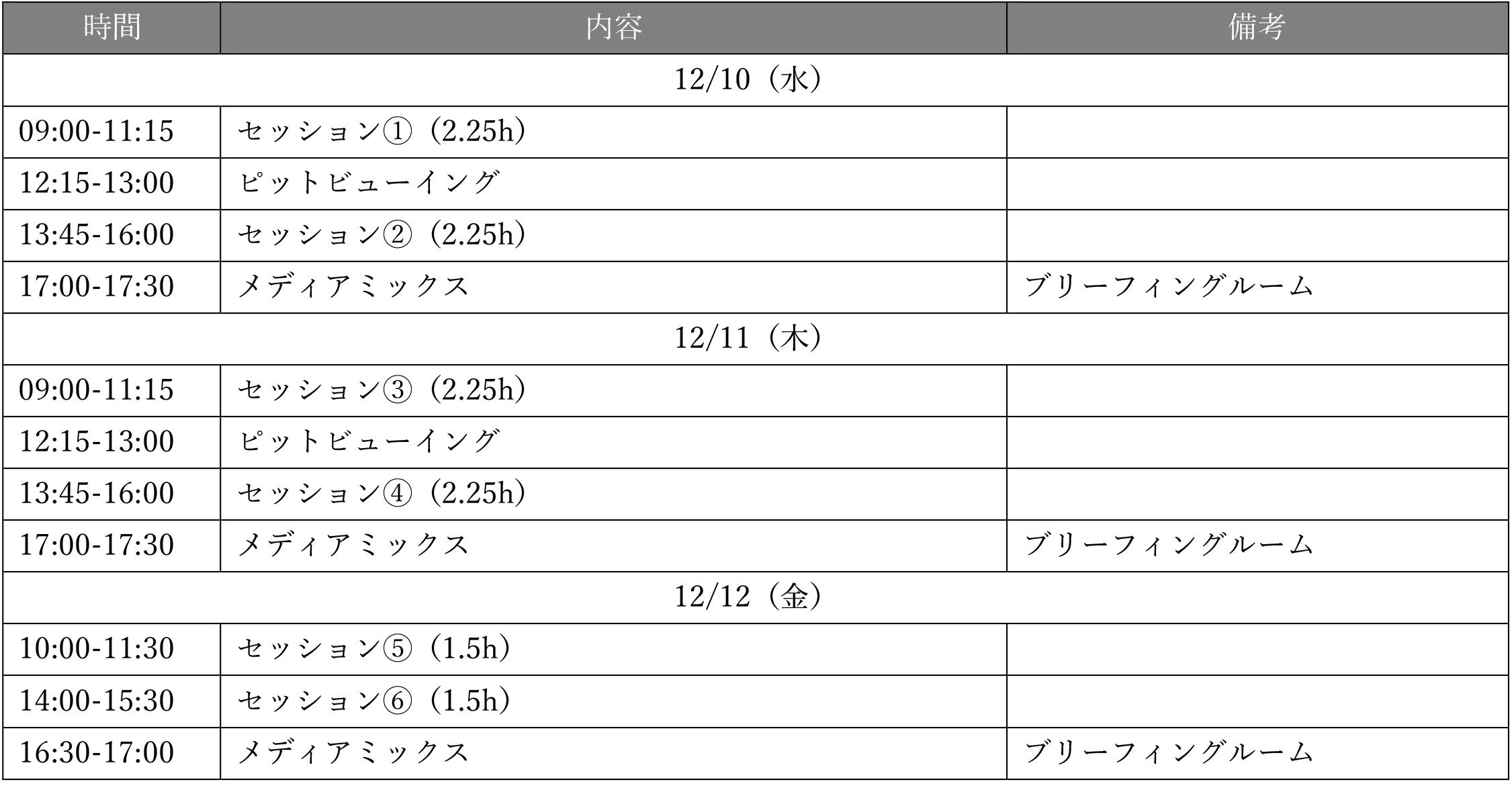 ※ 12/12(金)セッション5.及び6.の参加対象はルーキードライバー(決勝レース出走回数が積算で4戦未満)