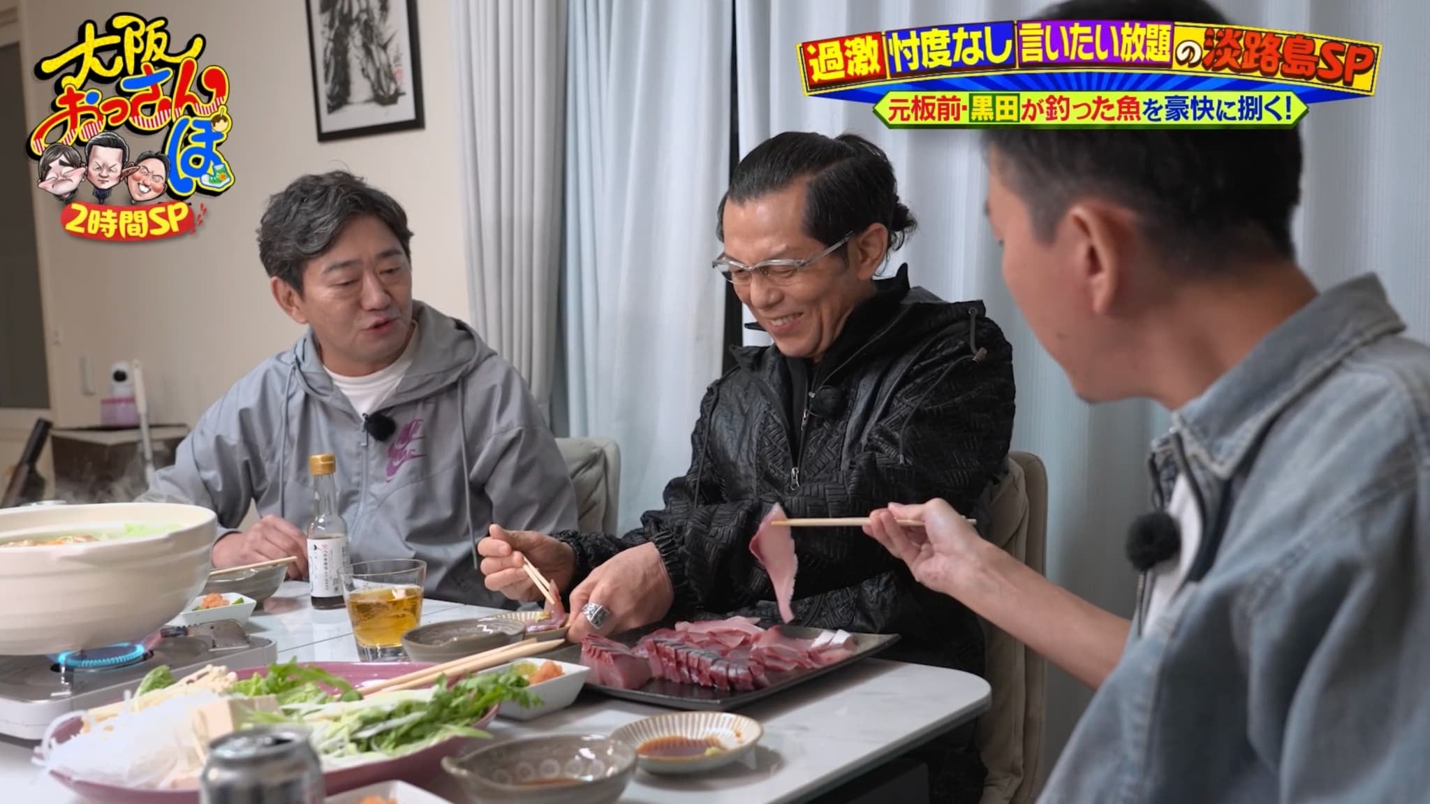 オープニングは釣り船の上から。まずはおっさん3人で淡路の海で魚を釣り、黒田がその魚を別荘で調理してくれるという。福田も「淡路島ツウですもんね」と盛り上げる。