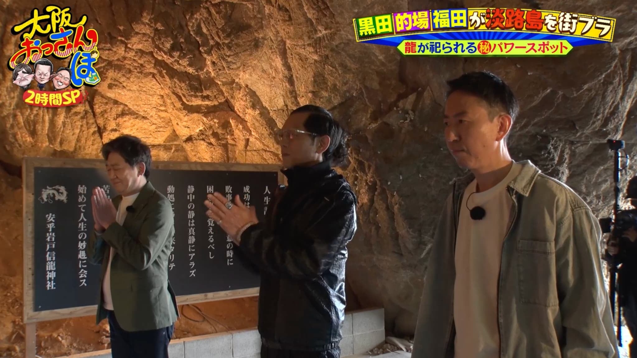 黒田が釣ったハマチを別荘で調理する前に、淡路島をおっさんぽ。まずは淡路島のパワースポット「安乎岩戸信龍神社(あいがいわどしんりゅうじんじゃ)」へお参り。実は神社仏閣が大好きという的場のために、もうひとつの神社へ案内する。