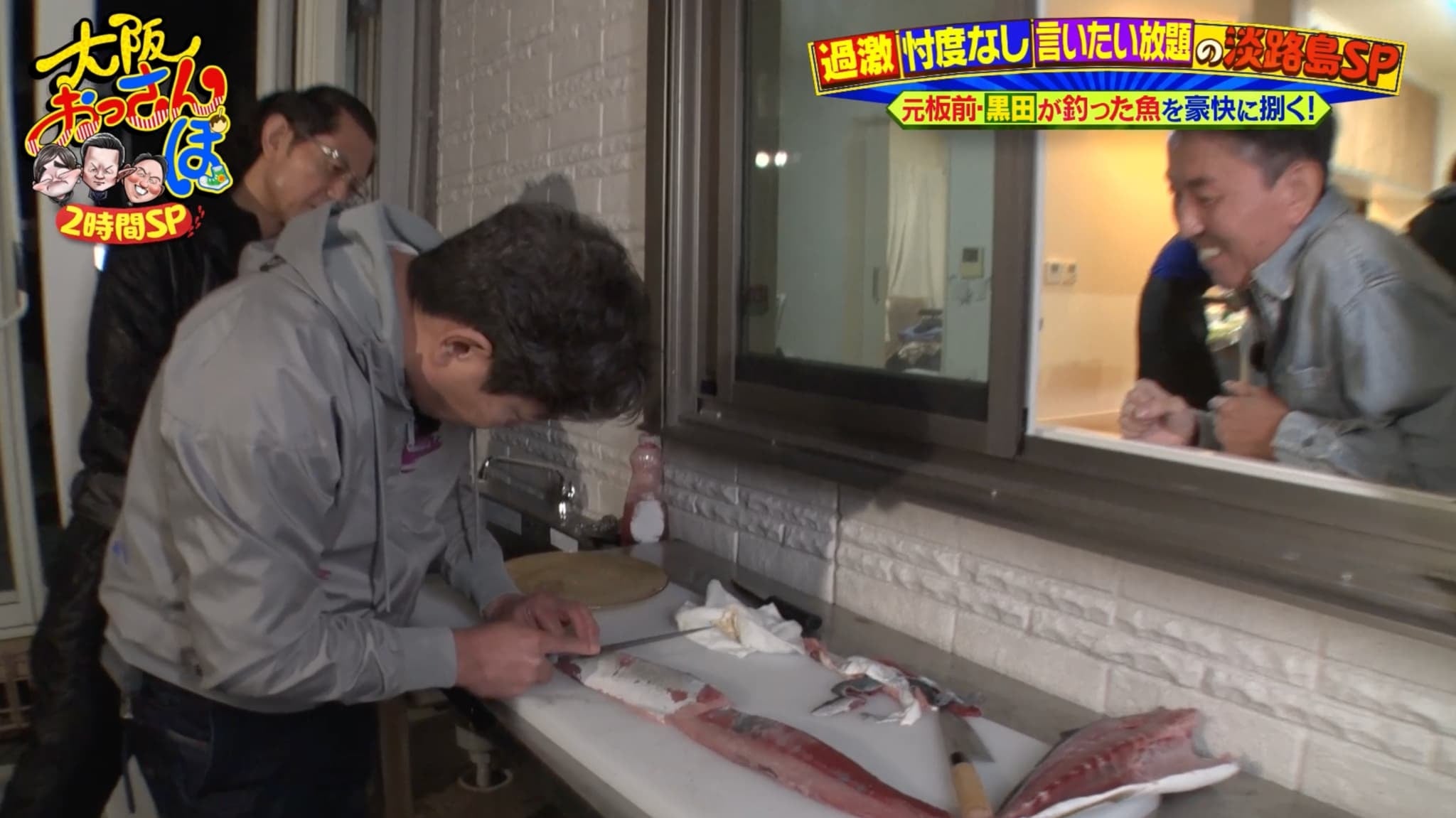 いよいよ黒田が淡路の海で釣ったハマチを黒田が調理! 華麗な包丁さばきに福田は「文句ばっかり言ってる黒田さんとは別人ですね」とほれぼれする。