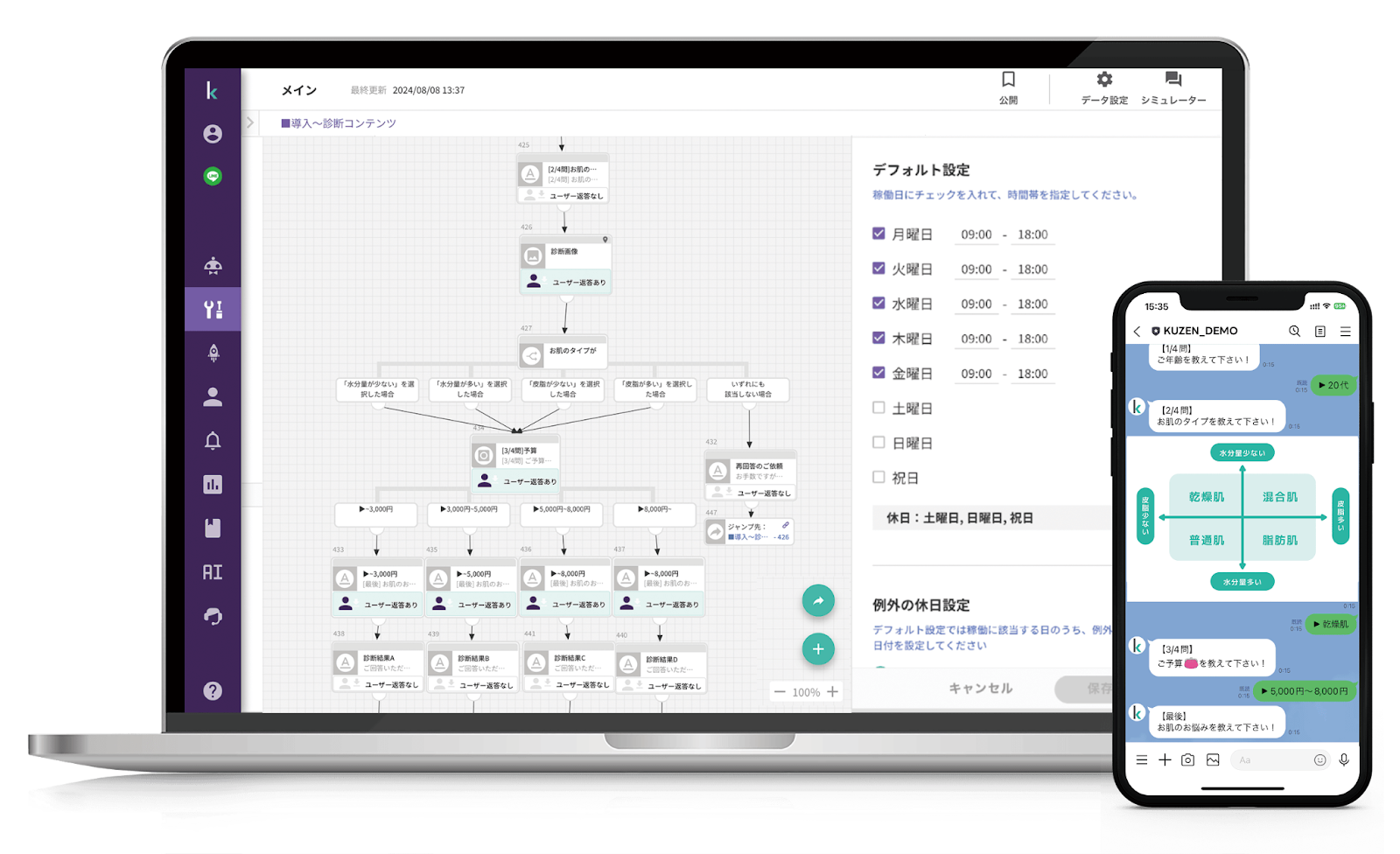 「クウゼン(KUZEN)」はマーケティング効果の最大化や業務効率化を支援する対話デザインプラットフォームです。外部のCRMやMAツール、コミュニケーションツールとの柔軟な連携や充実した運用サポートが特徴で、これまで業種・規模を問わず650社以上の企業様に導入されております。