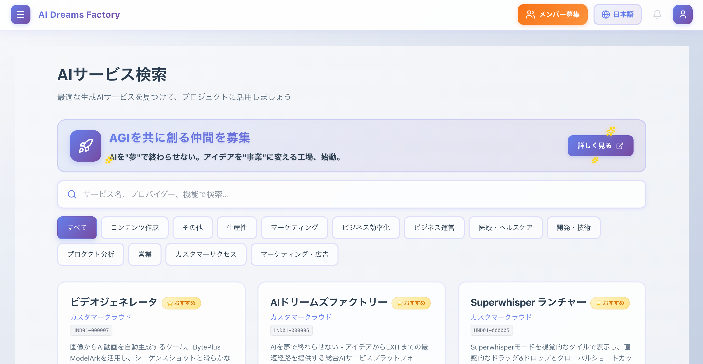 2025年より、AI Dreams Factory(AI生産工場) を正式稼働し、AIサービスやスタートアップの量産体制を構築。