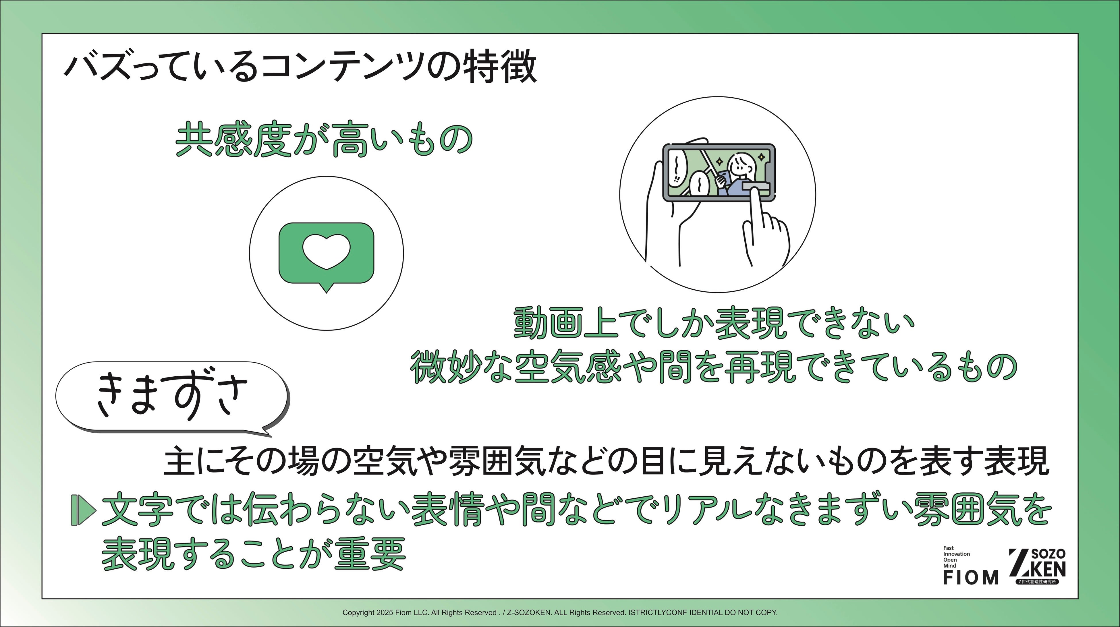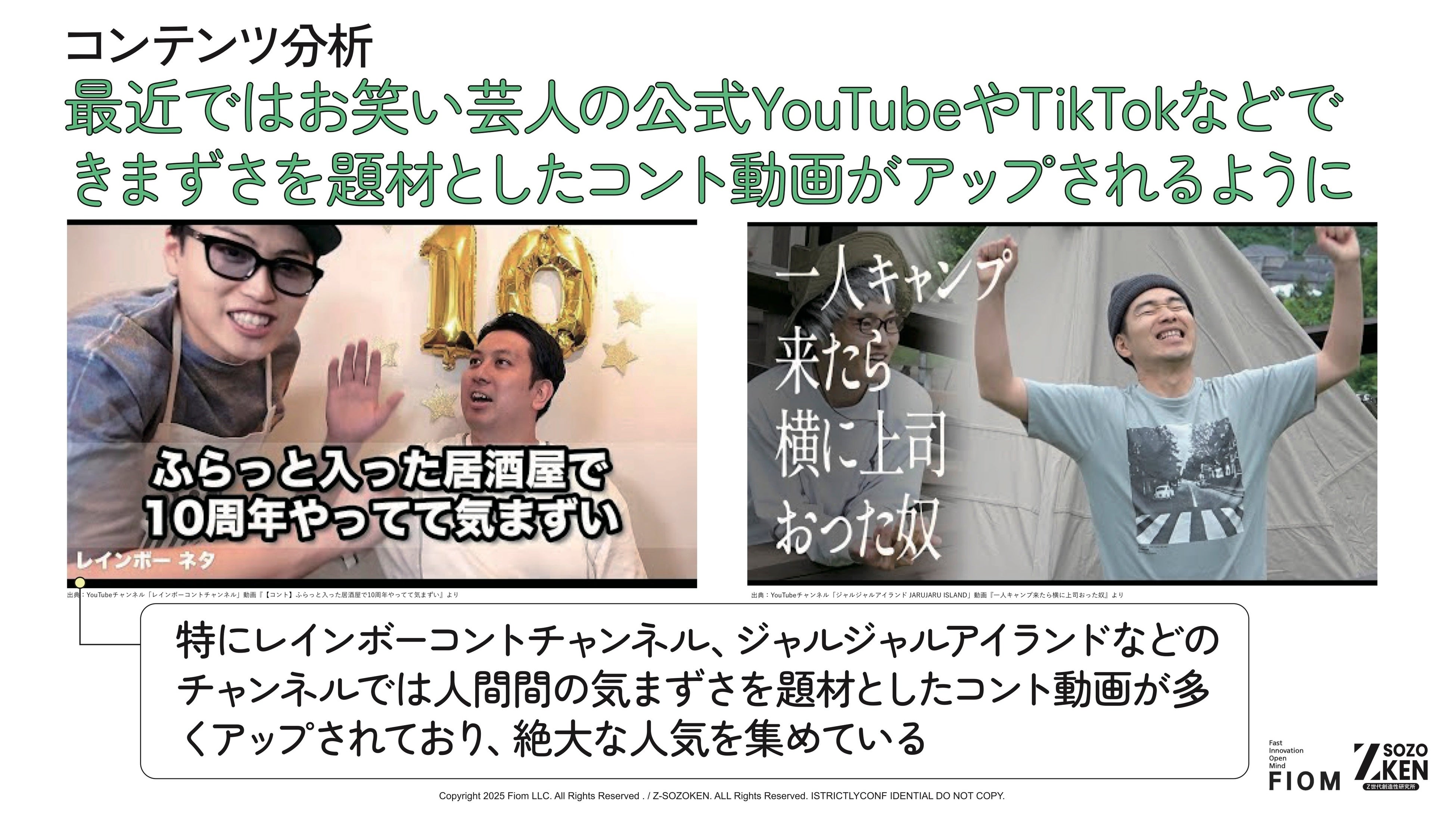 Z世代に特化したクリエイティブカンパニーFiom合同会社(本社:東京都渋谷区、代表社員:竹下洋平)が運営しているZ世代の実態や価値観を分析するシンクタンク、Z-SOZOKEN(Z世代創造性研究所)は、Z-SOZOKEN THINKTANK 最新調査研究レポートの第二弾として『Z世代の気まずいの感覚』についての調査研究レポートの第9章インサイトサマリー「共感コンテンツを通して広がる気まずさ」をリリースしました。