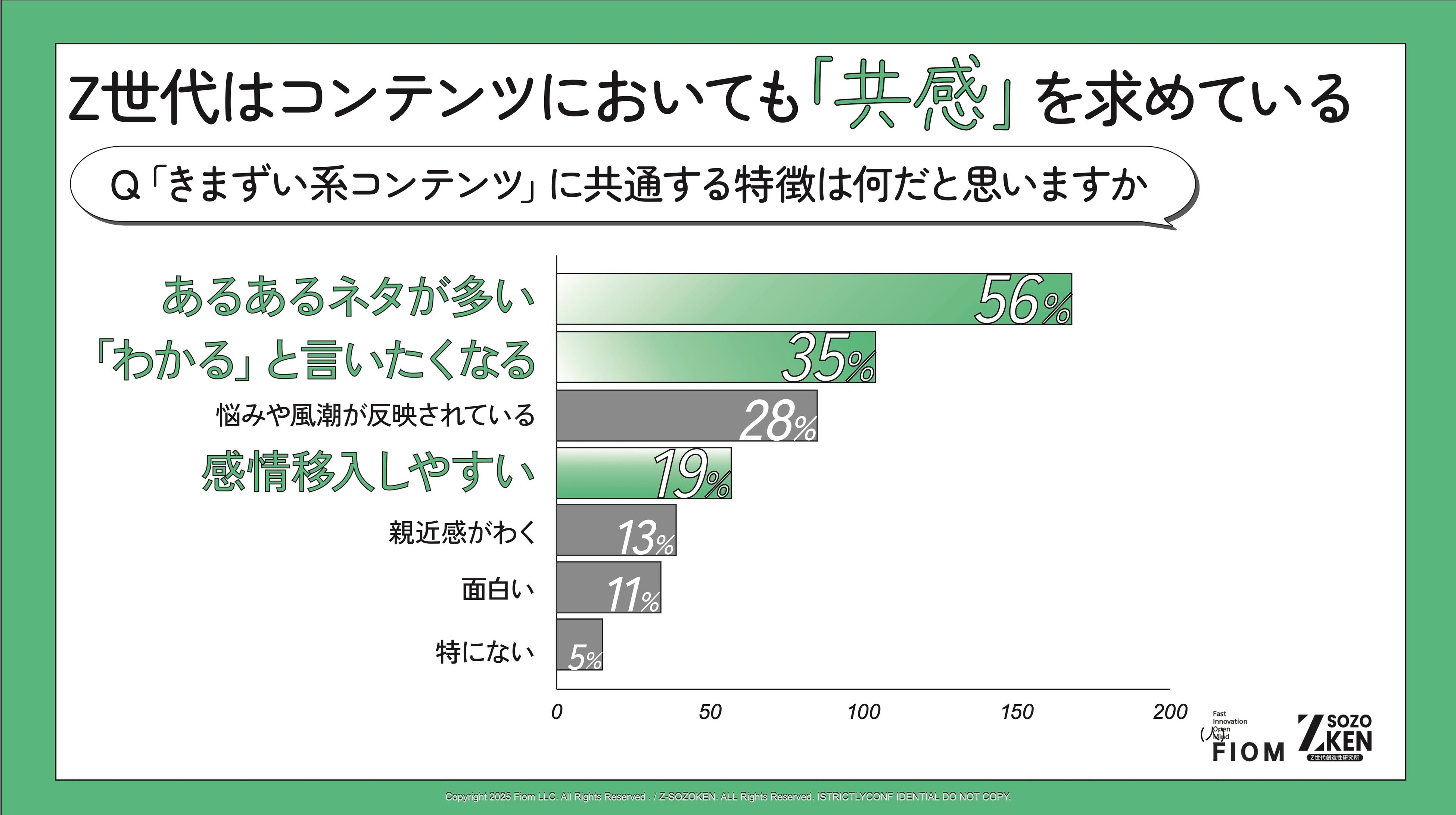 気まずい系コンテンツの特徴として、半数以上の56%が「あるあるネタが多い」ことを挙げています 。 Z世代はコンテンツに対して、受動的に楽しむだけでなく、「わかる!」「それな!」と反応し、承認することを求めています。気まずい動画は、その「共感承認欲求」を満たす最適な素材となっています。