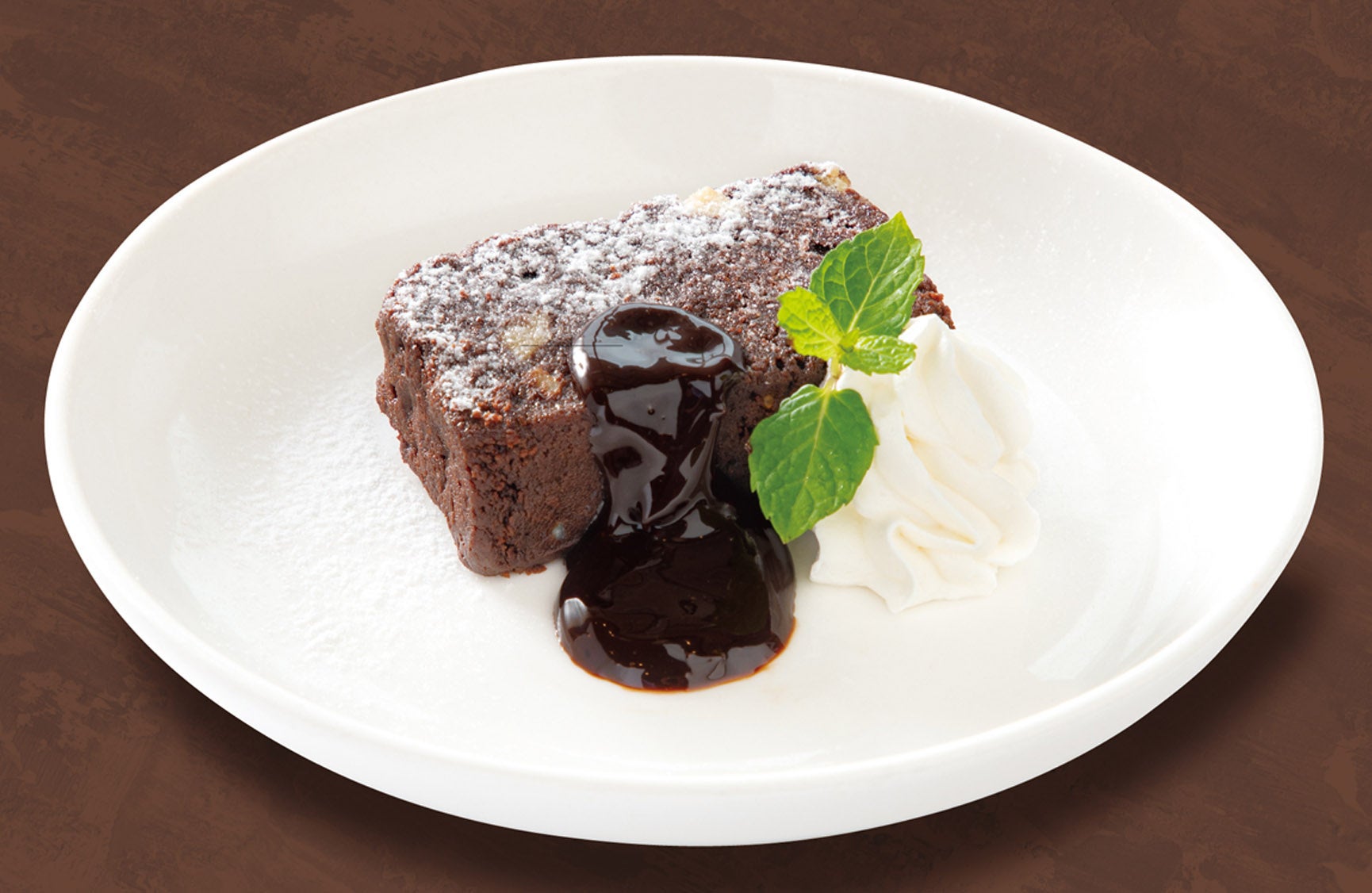 濃厚で程よい甘さのチョコケーキです。香ばしいクルミがアクセントになり、風味を引き立てます。寒い日にぴったりの冬季限定あったかデザートです。