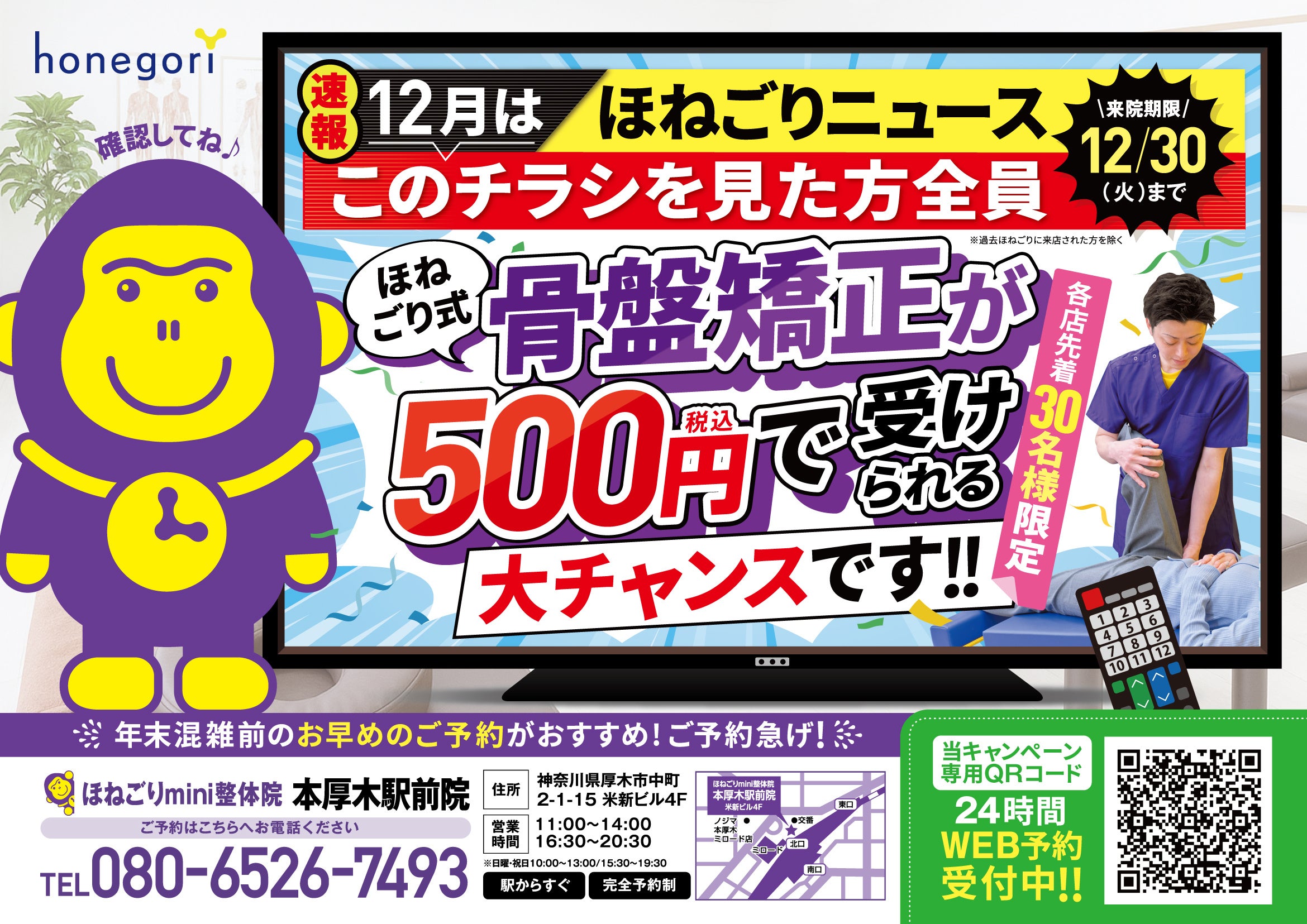 2025年12月11日(木)、本厚木駅北口すぐのアクセス抜群の立地にほねごりmini整体院の3院目となる【ほねごりmini整体院 本厚木駅前院 】がオープンします!