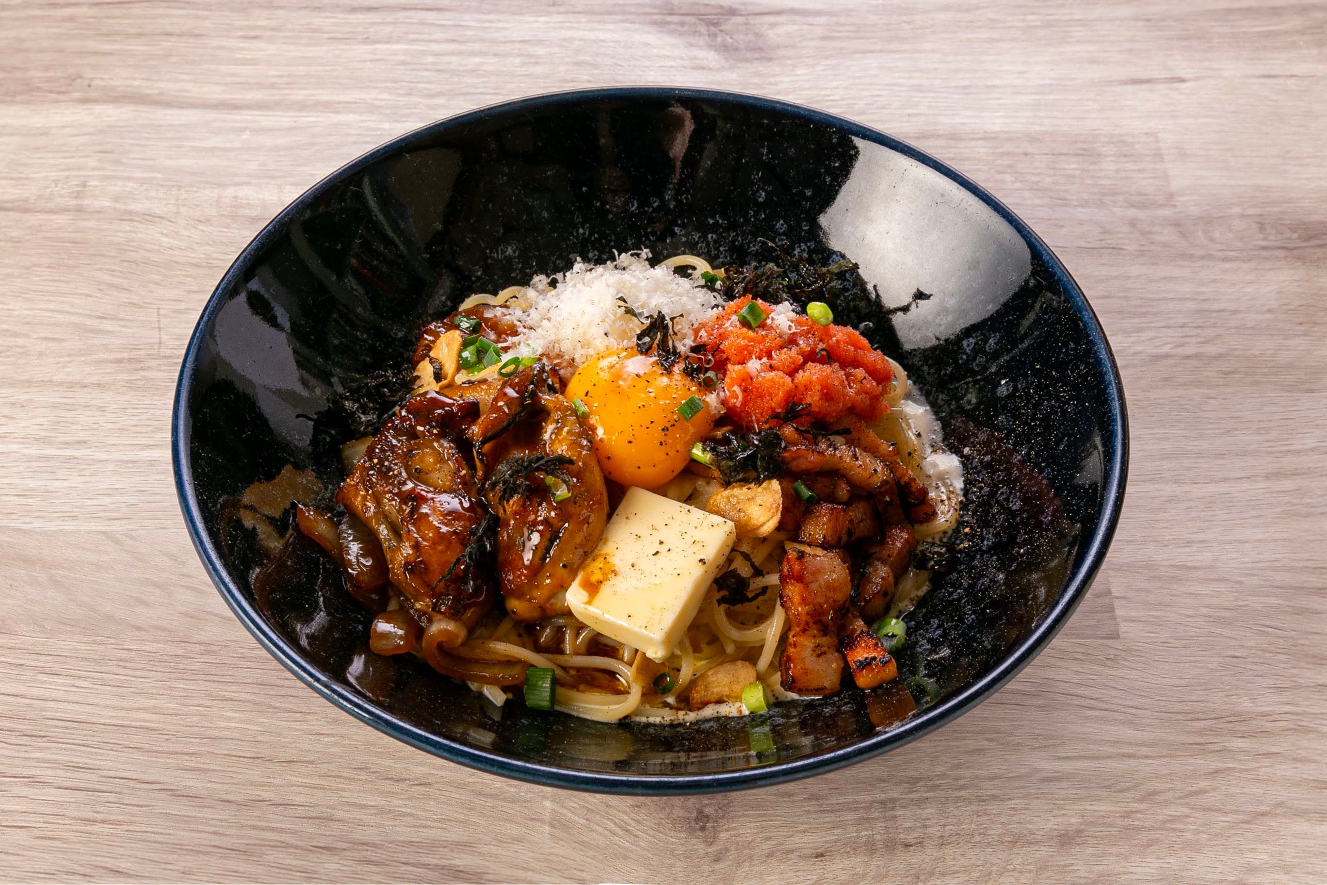 壁の穴の人気メニューの一つ、やみつき明太子カルボナーラに醤油で香ばしく仕上げた牡蠣をトッピング。少しずつ混ぜながらお楽しみください。