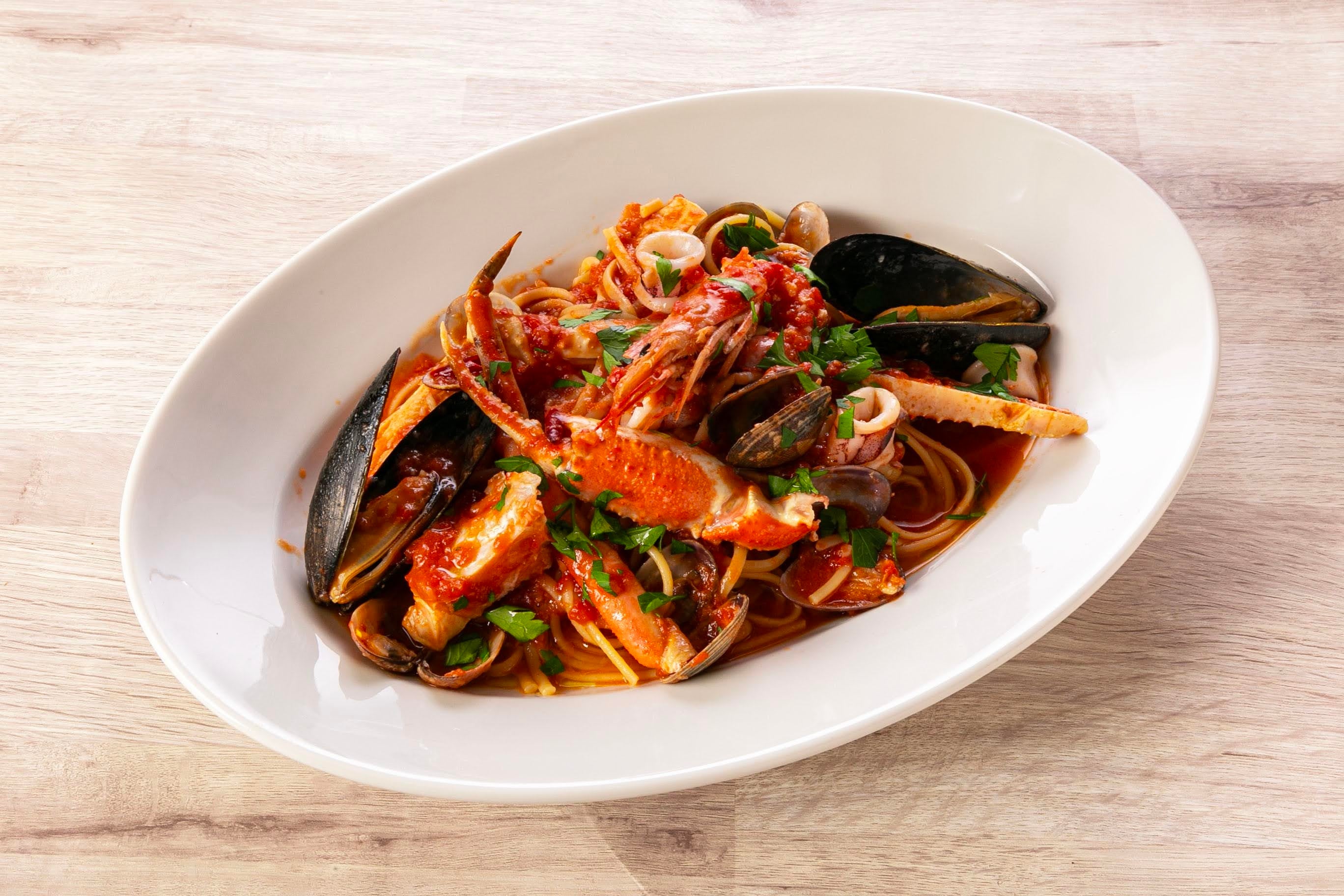 殻付きずわい蟹、赤海老、ムール貝、あさり、ヤリイカなど、色とりどりの海鮮を贅沢に使用したペスカトーレです。もっちり食感のリングイネとの相性も抜群です。