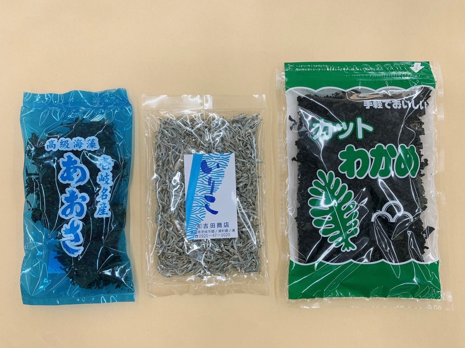 うに、壱岐牛カレー、アジの開き、乾燥あおさなどの“食卓のお供”から、かすまきやメロンカステラといったおやつまで、壱岐の味覚を幅広く取りそろえています。
