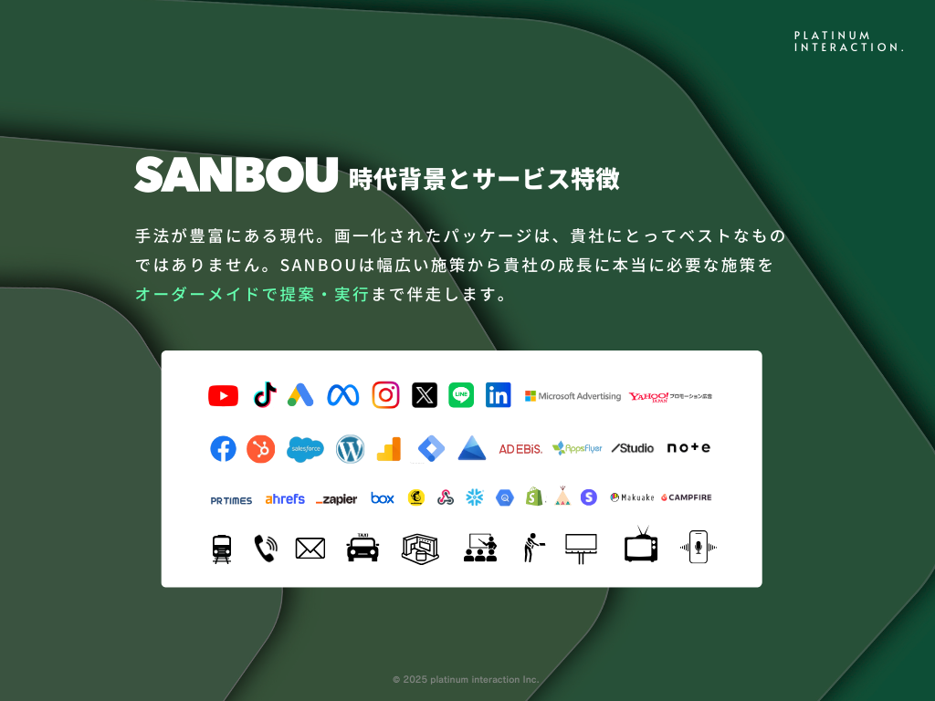 株式会社PLATINUM INTERACTION(本社:東京都品川区、代表取締役:佐藤圭達)は、事業成長を推進する実働型マーケティングパートナー「SANBOU」の正式リリースを行いました。