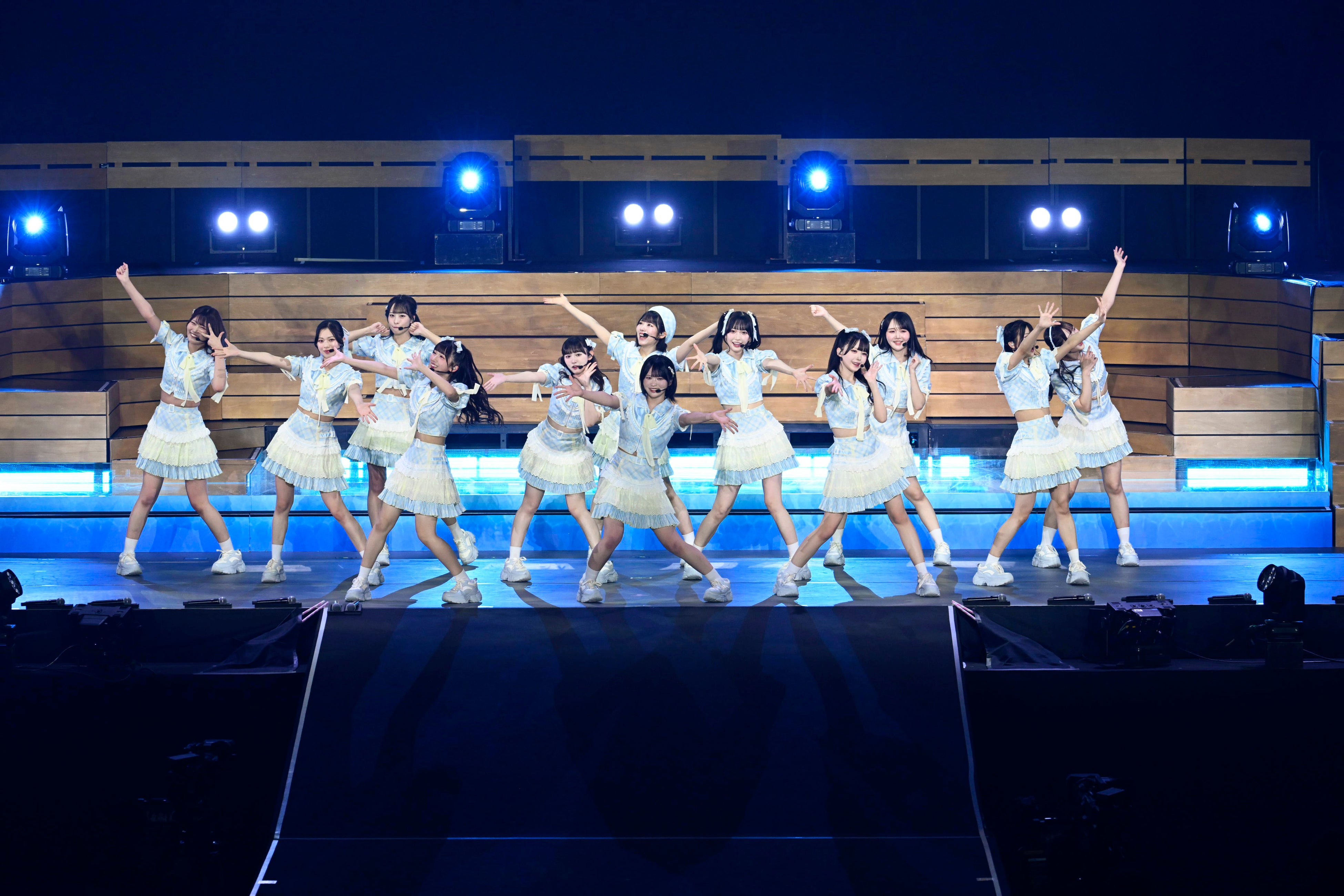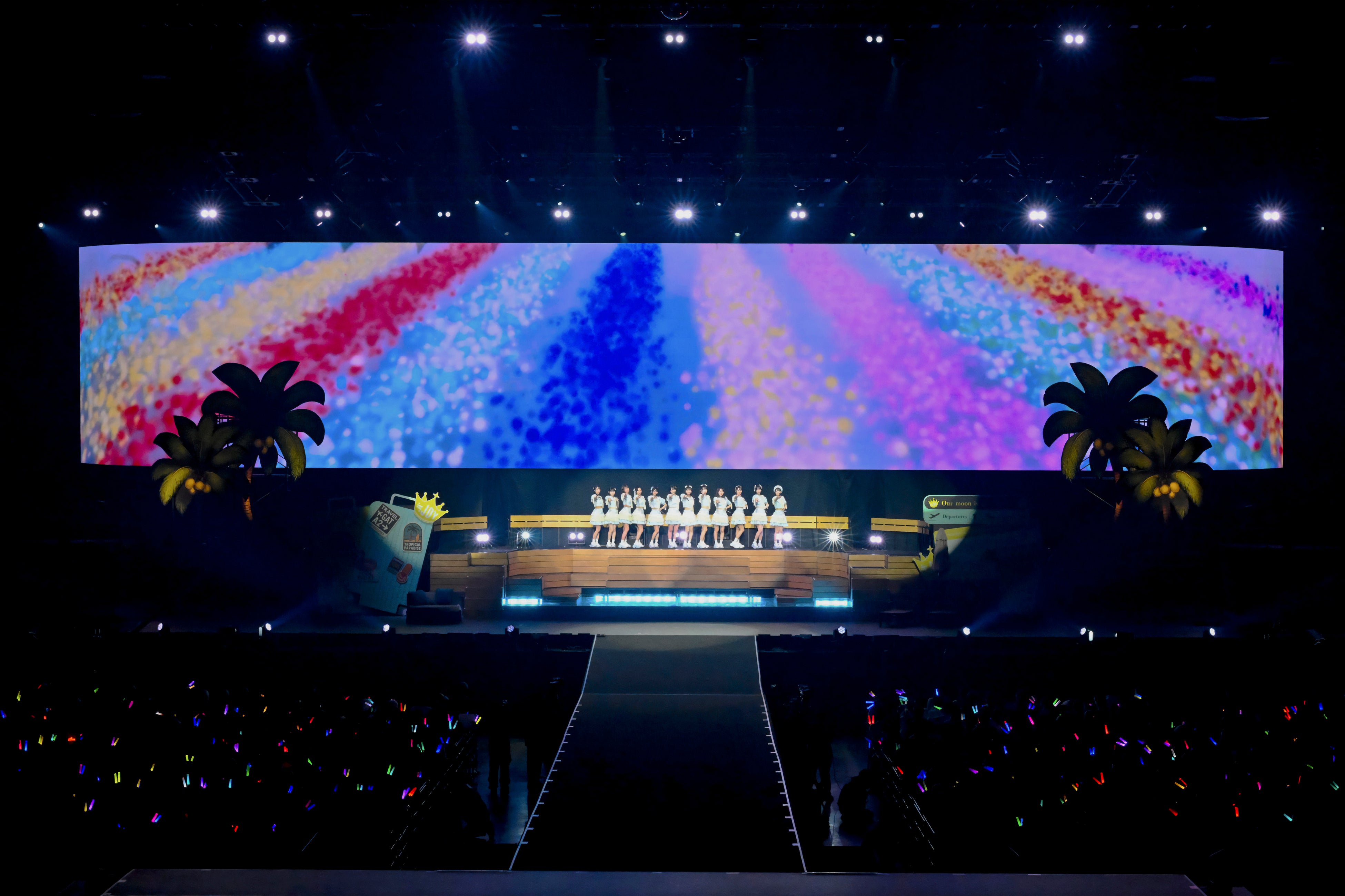 その後も先輩グループのカバーを盛り込みつつ、華やかな“空の旅”を経て南の島へ着いた≒JOY。彼女たちは『ブルーハワイレモン』などのサマーチューンを連発して会場をさわやかな空気で満たし、ラストスパートでは『体育館ディスコ』『初恋シンデレラ』などの鉄板曲を畳みかけた。そして小澤が「メンバーみんなで試行錯誤して、挑戦できたツアーだったんじゃないかなと思います!」とツアーを振り返り、今後の活動への意気込みを述べたあとは『ネバギバ!生きろ』のパフォーマンスへ。ファンに宛てたメッセージが映し出されるスクリーンを背に、メンバーは晴れやかな歌声を響かせた。
