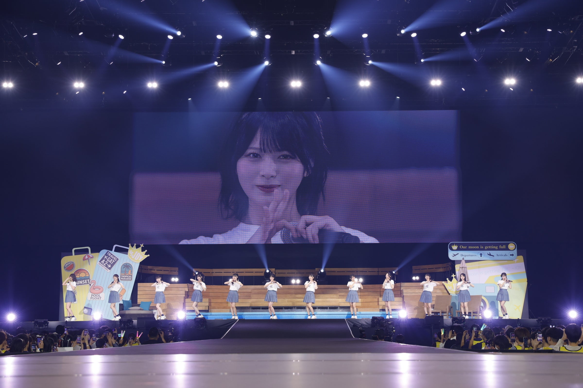 今回のツアーではメンバーがキャビンアテンダントに扮し、空の旅をイメージした世界観の中でライブが進行した。CA風の衣装を身にまとってステージに登場した≒JOYは、ツアーのテーマソング『いま、月は満ちる』(≒JOY 全国ツアー2025「Our moon is getting full」テーマ楽曲)で勢いよくライブをスタートさせる。『いま、月は満ちる』は≒JOYのプロデューサーである指原莉乃が、過去に書いた楽曲のカバー。観客による息の合ったコールも相まって、開演早々に大きな盛り上がりが生まれた。『スイートシックスティーン』ではメンバーがセンターステージからサインボールを投げたり、トロッコに乗って笑顔を振りまいたりと、ファンサービスにあふれるパフォーマンスを繰り広げた。