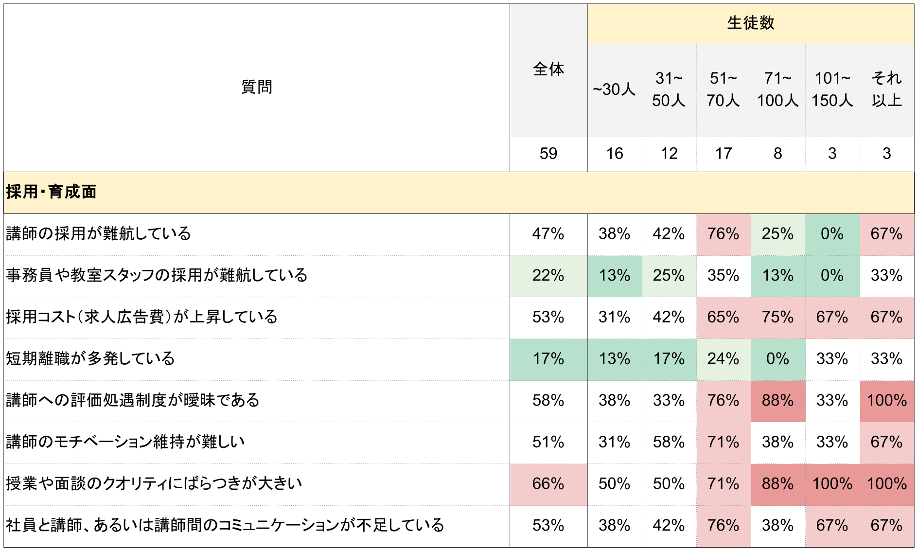 1.同様、生徒数が多くなるにつれ、採用コストや評価処遇制度の曖昧さ、講師間のクオリティ差といった課題が見えてくる結果となりました。
