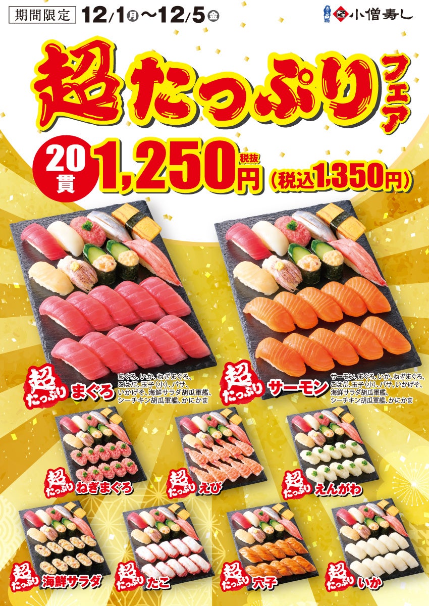KOZOホールディングス株式会社の子会社である株式会社小僧寿しは、持ち帰りすし店「小僧寿し」にて、12月1日(月)~5日(金)の平日期間限定で『超たっぷりフェア』を販売します。(※店舗により未実施の場合がございます)