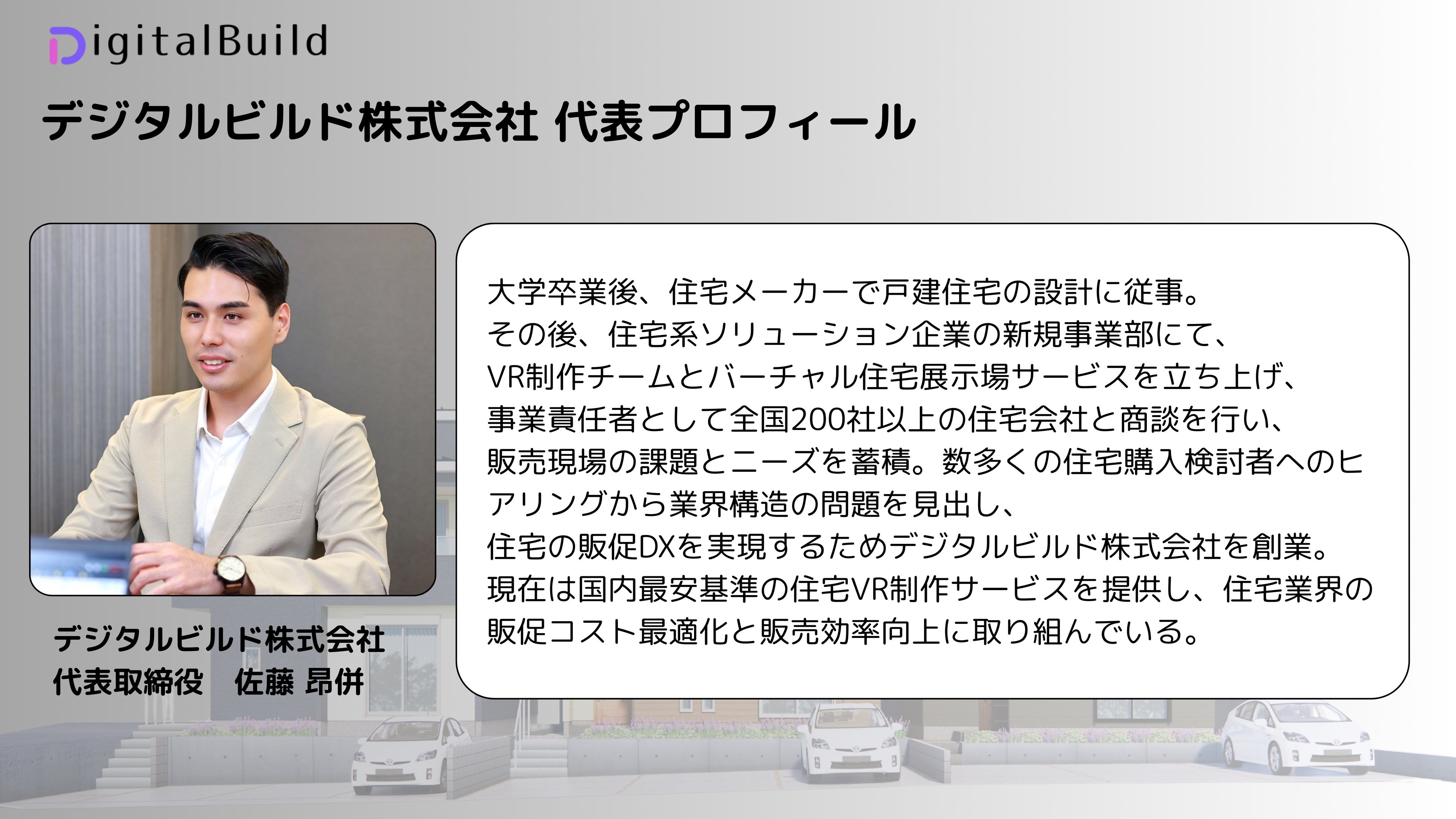 弊社代表の佐藤昂併は、約10年間にわたり住宅業界に携わり、住宅設計、住宅メーカー向けコンサルティング、バーチャル住宅展示場の事業責任者として、多角的な視点から業界構造を見てきました。