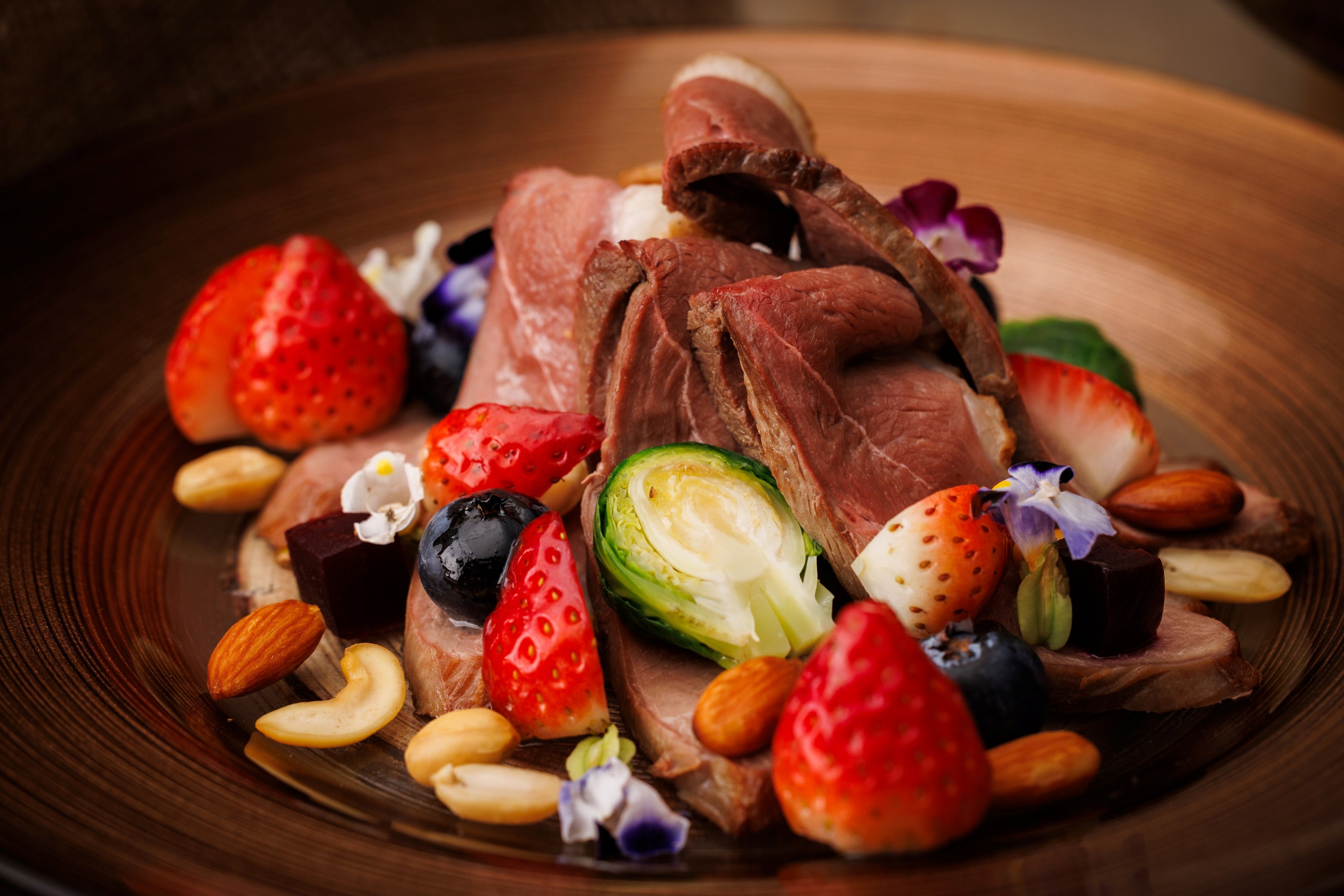ナトゥーラのブッフェを代表する「鉄板焼サーロインステーキ」は、贅沢に厚切りにした上質なサーロインをシェフが目の前で豪快に焼き上げ、食べ放題で提供する一品です。見て、香って、楽しめる鉄板焼の実演コーナーで、存分にステーキをご堪能ください。また本フェアでは、甘酸っぱい苺とバルサミコソースを合わせた「合鴨のロースト」や、やわらかく蒸し上げた金目鯛を和風ソースでさっぱりと仕上げた「金目鯛のヴァプール」、やわらかいフィレ肉を香ばしく揚げ焼きにした「豚フィレのコルドンブルー」など、シェフ自慢のメニューの数々がお楽しみいただけます。