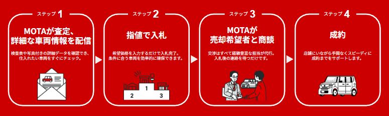 本サービスは、従来買取店様が行っていた「アポイント調整」「実車査定」「商談」のプロセスをMOTAが代行し、成約時に手数料が発生する「成果報酬型」のサービスです。