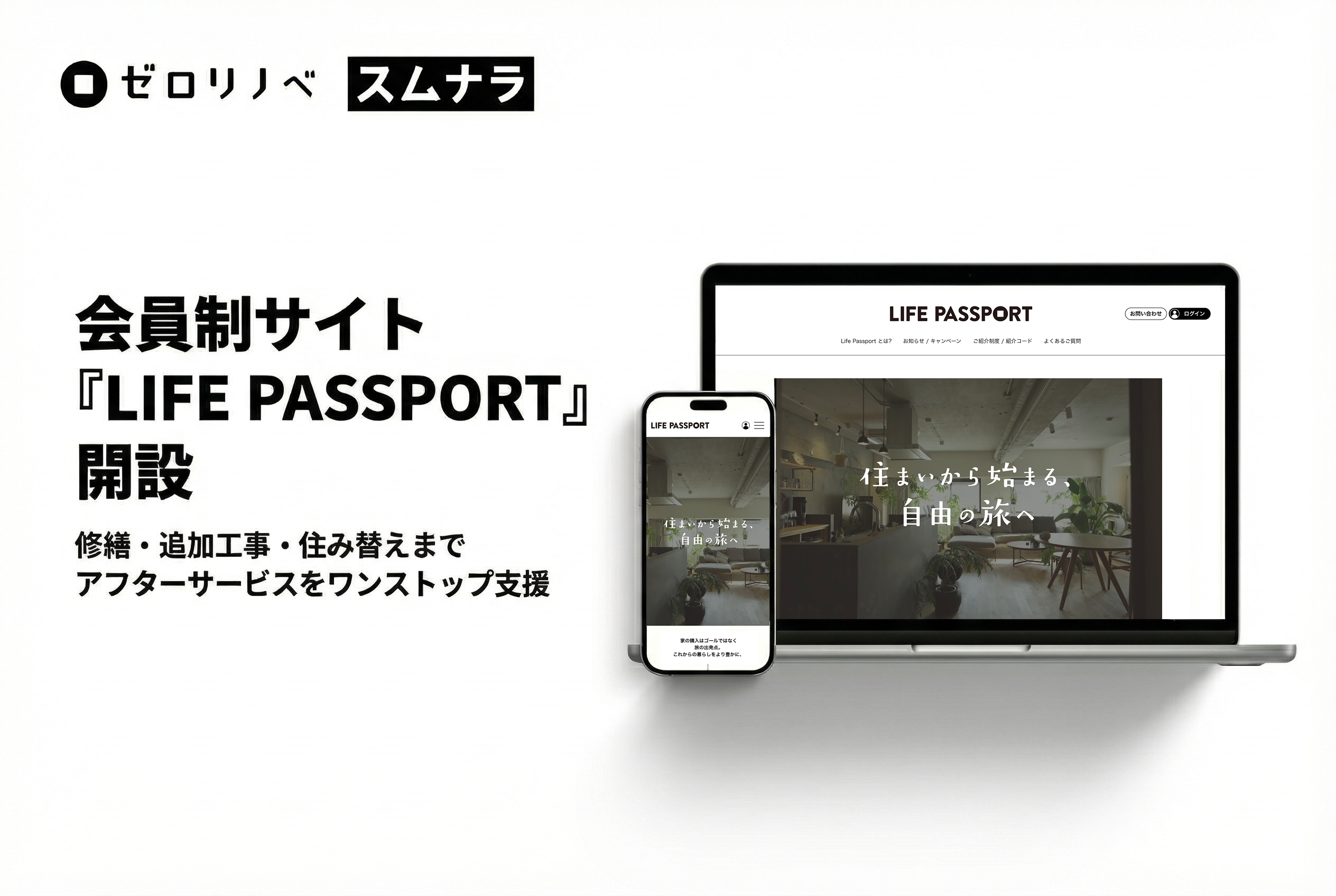 この名称には、人生全体の自由を象徴する「LIFE」と、新たな旅の始まりを表す「PASSPORT」という意味を込めました。ゼロリノベおよびスムナラの利用者様だけが手にする「優待の証」として、長期的な安心と特別な価値を提供します。