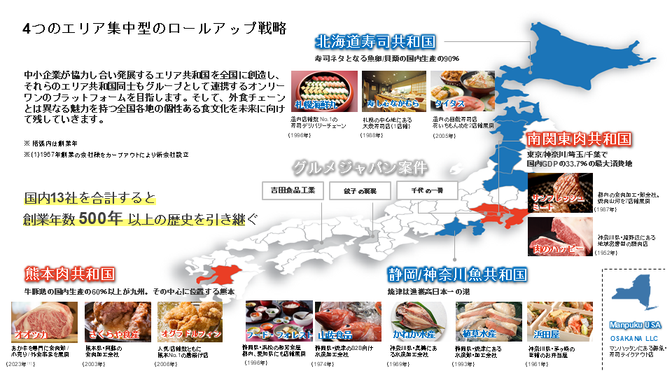 事業承継させて頂いた会社において、肉と魚を軸とした4つ(熊本、静岡/神奈川、南関東、北海道)のエリアにて共和国を形成いたしました。今後は既存の4つのエリア共和国の拡大を図りながら、隣接したエリアでの新たな事業承継/共和国づくりにも挑戦し、エリア共和国同士もグループとして連携するオンリーワンのプラットフォームを目指します。