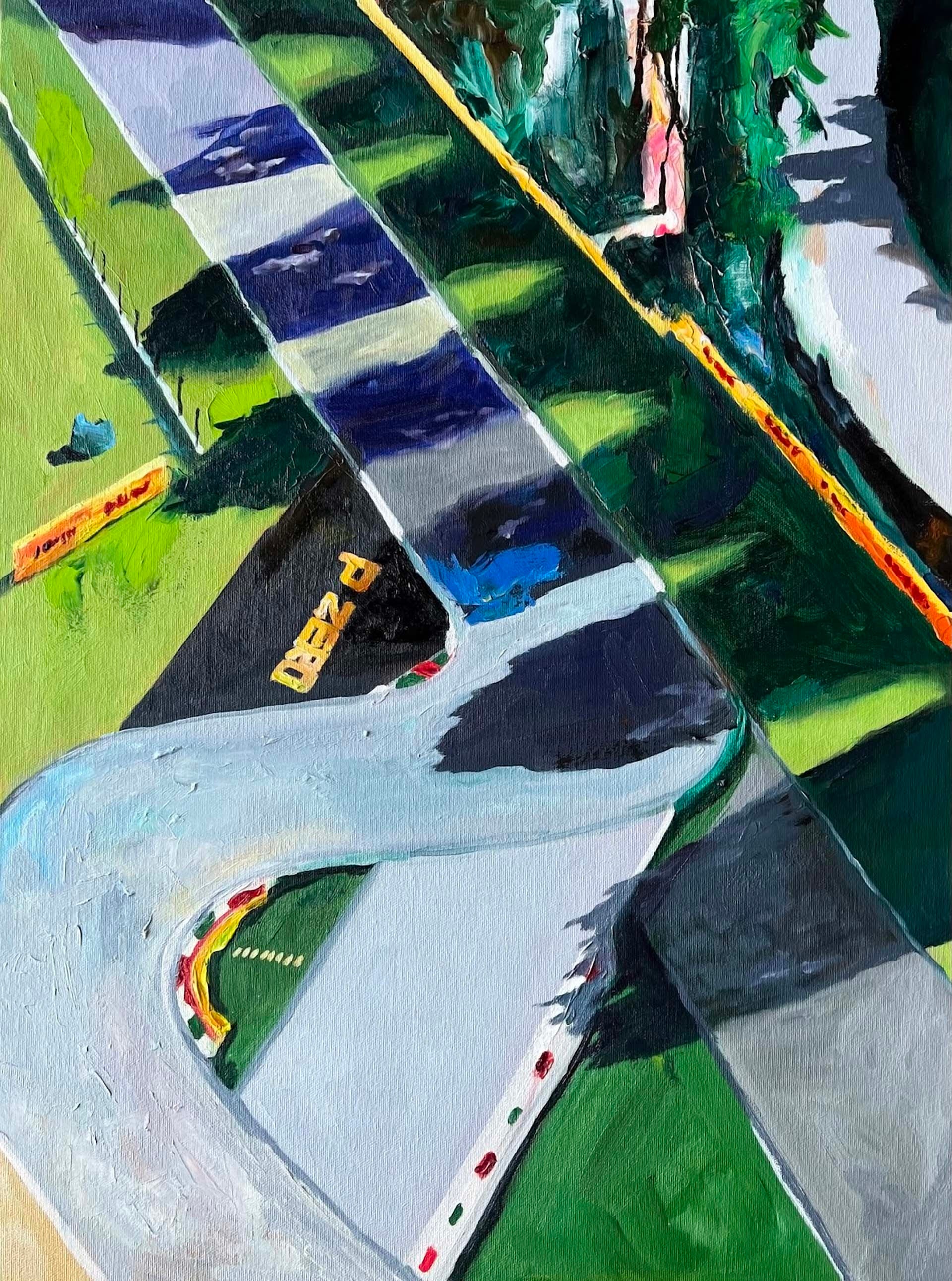 インタビューでは、Googleストリートビューを手がかりに風景を描くようになったきっかけや、標識やデジタル画像といった記号化された現実を油彩へと置き換え、そこに偶然生まれる色やノイズを取り込みながら、実在しない風景を立ち上げていく――その独自のプロセスに触れています。