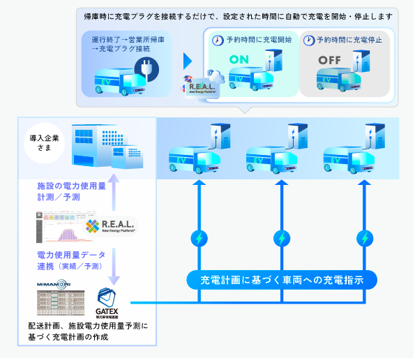アイ・グリッドといすゞでは2024年10月より、同サービスの商用化に向けた実地検証を行ってまいりました。具体的には、商用車の運行管理や車両の稼働サポートサービスを提供するいすゞの商用車情報基盤「GATEX」の充電計画の立案と、充電計画に基づく充電制御機能に施設の電力使用量の実績・予測を行うアイ・グリッドのエネルギーマネジメントプラットフォーム「R.E.A.L. New Energy Platform(R)」を連携させ、配送EVの運行計画と施設デマンドを考慮した充電計画の立案および充電計画に基づく充電制御機能を検証しました。いすゞのエルフEVを導入先施設にて実際の運行・車両管理に合わせて施設エネルギーマネジメント機能するかフィールドテストを行ってまいりました。