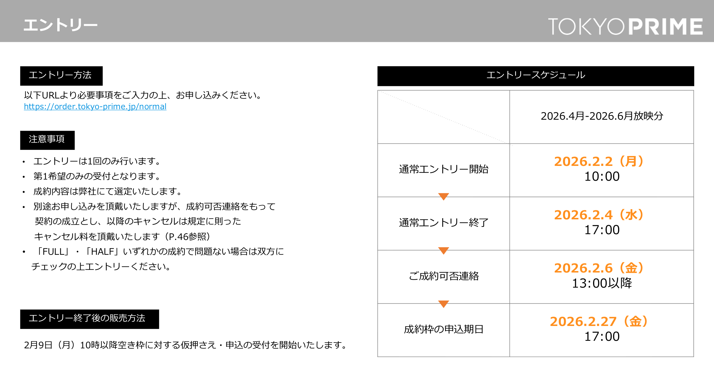 2026年2月2日(月)10:00より2026年4月-6月分の通常エントリーの受付を開始します。
