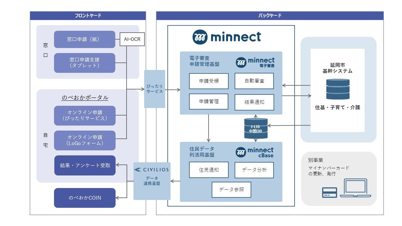 本システムは、基幹システムと連携し、申請から電子審査、データ登録、住民通知まで一気通貫で処理することが可能です。電通総研が開発する「minnect(ミネクト)電子審査」を導入することで、データの一元管理と自動審査を実現し、事務処理の迅速化と精度向上を推進。加えて、住民への通知は住民CRM機能を有した「minnect cBase(ミネクト シーベース)」を活用することで、デジタル通知を実現し、郵送コストの削減と業務負担の軽減を図ります。