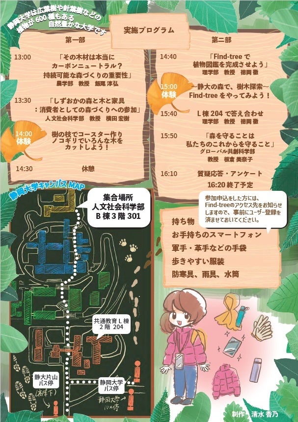 本イベントでは、カーボンニュートラル社会実現への取り組みとして「森林の役割」に注目し、学内の「森」を活用し森林とカーボンニュートラルの関係について学びたいと思います。
