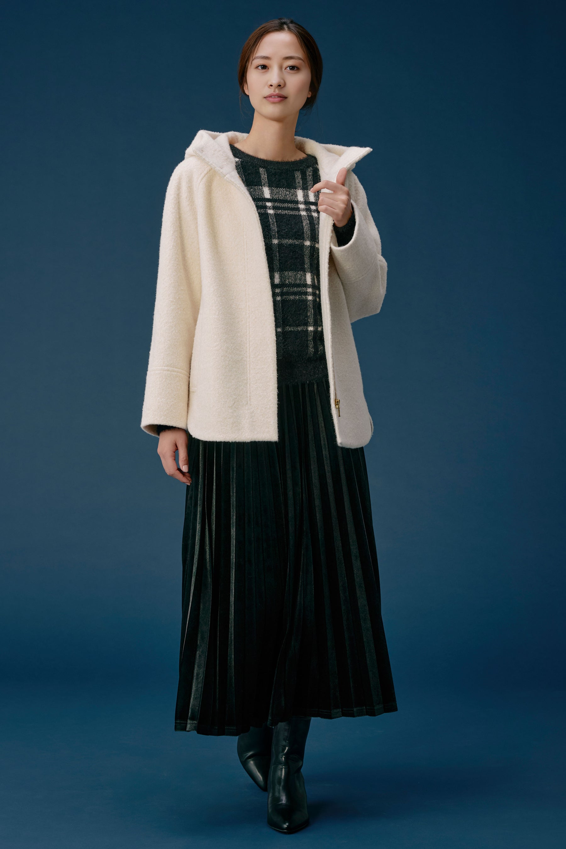 冬の黒に映えるやわらかなホワイトアウター。大きめフードでコンサバすぎず、合わせやすい。ふんわりとした素材に、ラグランスリーブのゆとりあるシルエットで動きやすく快適◎中に着込んでもノーストレス。ダークカラーが増える冬だからこそ、白で魅せるスタイルがいつもと少し違う特別な着こなしを引き立ててくれます。