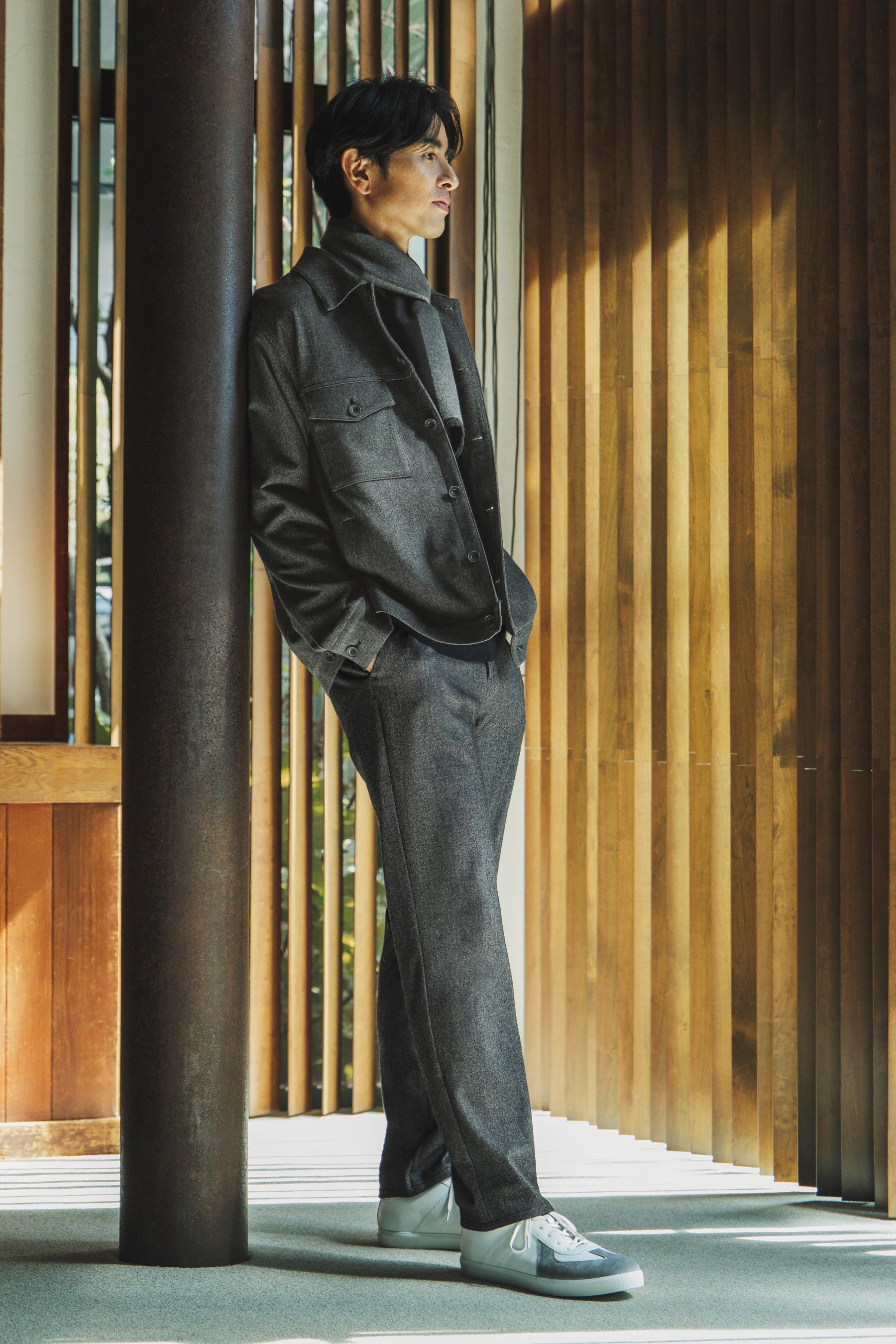大人の余裕と品格を感じられるグレーのセットアップは、カジュアルなトラッカージャケットとトラウザーズが新鮮。