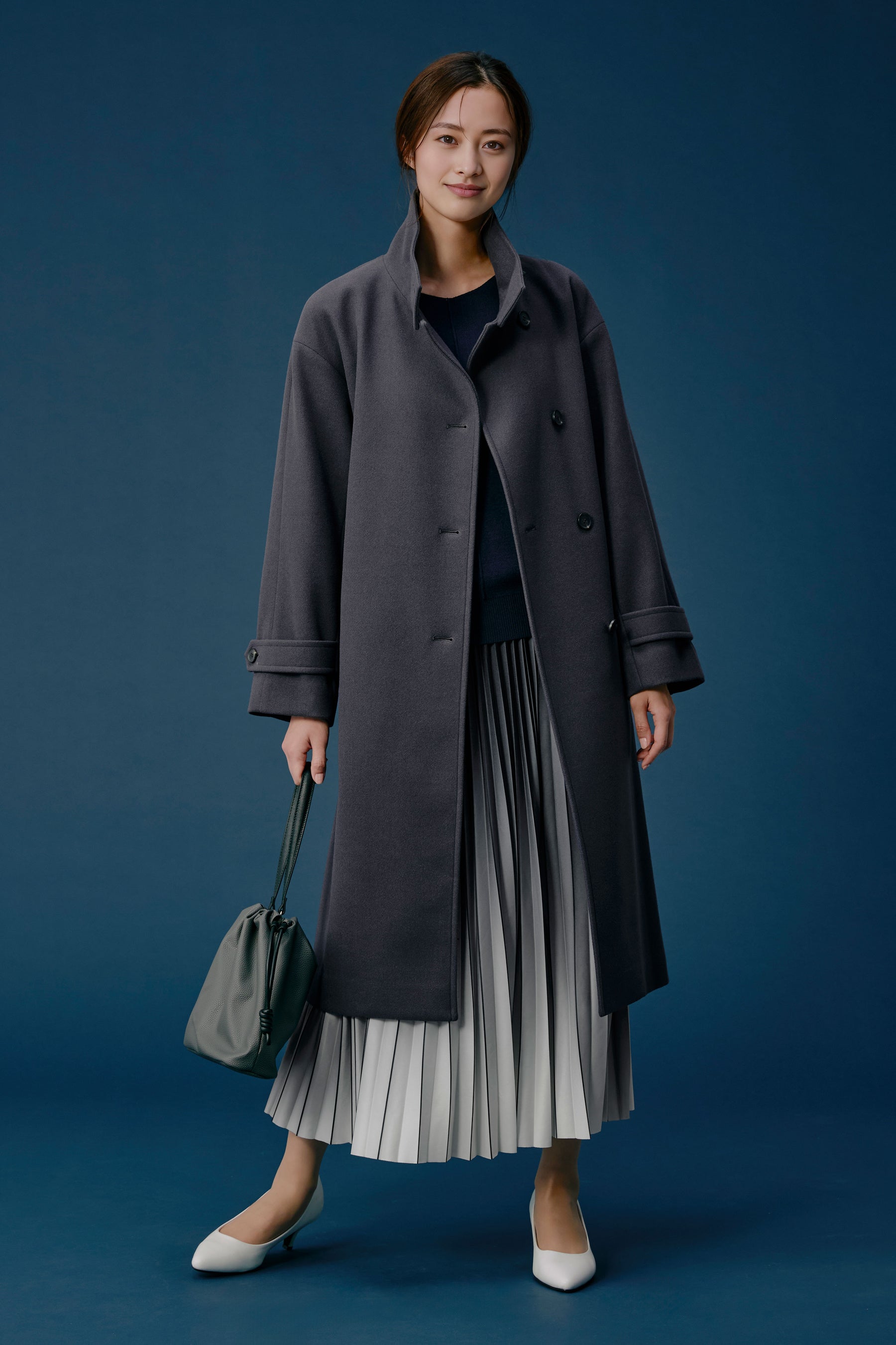 いざという時のために、きちんとしたシーンに対応できるアウターは一着は持っていたい。タイトシルエットとスタンドカラーが大人の佇まいを作り、かしこまった行事にもOK。前を開けて重ね着を楽しむのはもちろん、閉じて共布ベルトでウエストマークをしても違った表情が堪能できます。