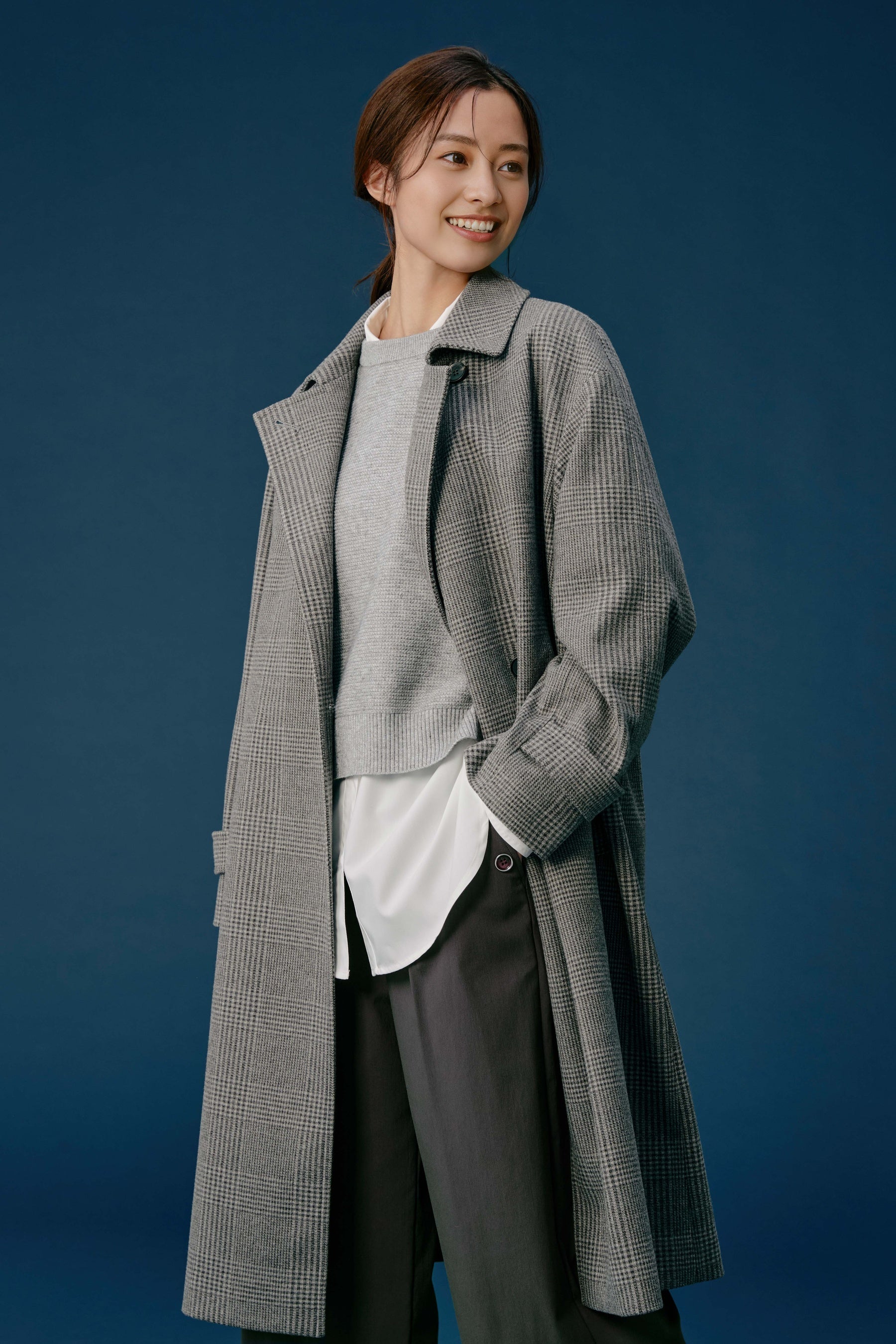 ショート丈のステンカラーコートは、どんなアイテムにも馴染みやすくデイリー使いに最適。ロング丈よりも軽快でアクティブな印象だから、チェック柄のセーターを合わせて、ほどよい柔らかさとクラシックなムードをプラス。モノトーンのグラデーションが、冬の素材感をより引き立てます。気負わず羽織れて、シーンを選ばない、今のスタンダードです。