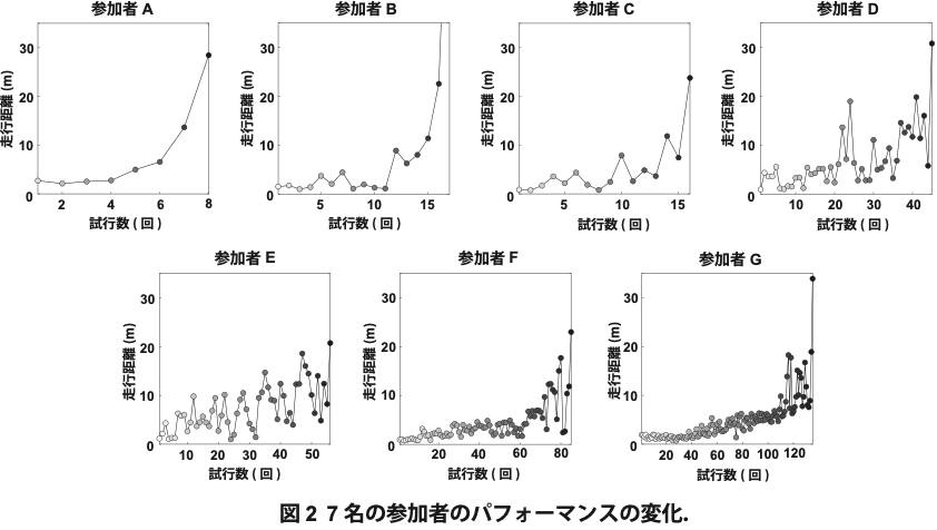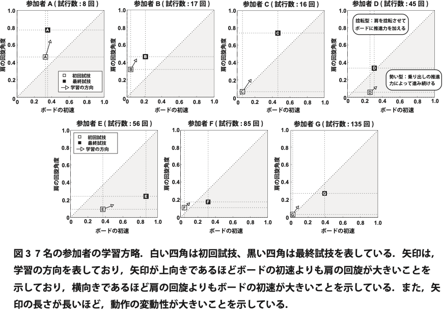試行ごとの動作のばらつきを分析したところ、動作の変動性が高い(=いろいろ試してみる:試行錯誤)学習者ほど上達が早いことが判明しました。
