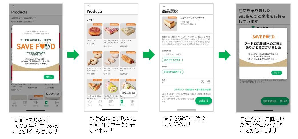 Mobile Order & Payの画面で店舗を選択すると、同プログラムを実施中の店舗の場合、対象商品に「SAVE FOOD」のマークが表示され(※)、画面上でご注文いただくことができます。ご注文が完了すると、画面上に同プログラムにご参加いただいたことへの感謝をお伝えするメッセージが表示されます。