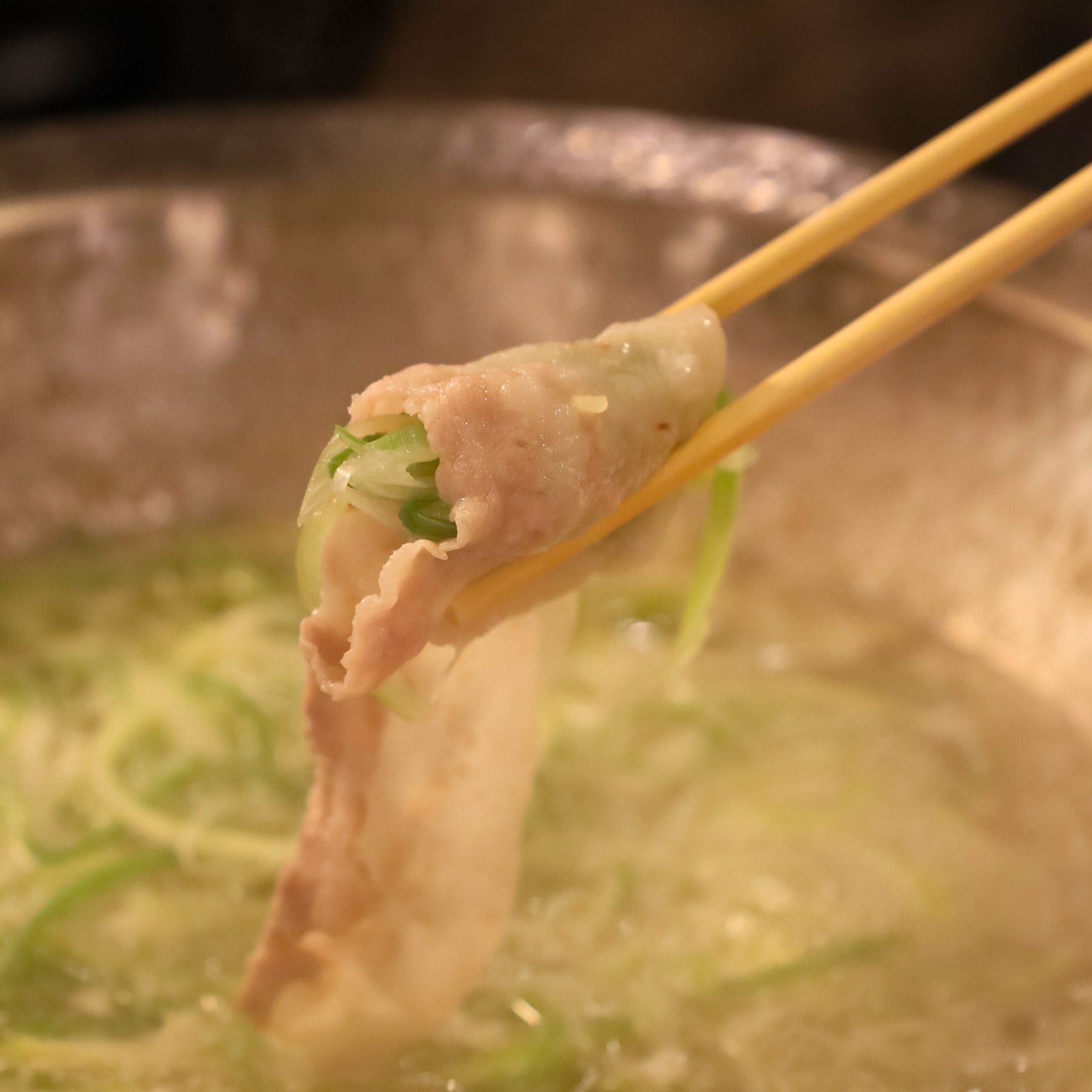 豚しゃぶの食べ方まずは鍋の中心に、たっぷりのネギを入れてください。匠だしの旨みを吸ったネギは、一気に香りと甘さが際立ち、六白黒豚との相性が抜群に良くなります。