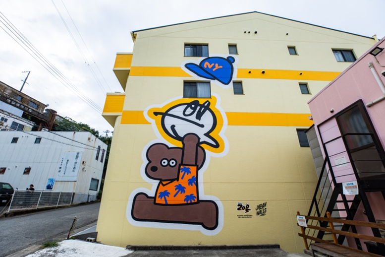 本プロジェクトで2人が挑んだのは、白浜町・柳橋通り近くの集合住宅の大きな壁面。松本氏が2023年に描いたキャラクター「ねずみのANDY」と、中山氏が2024年に制作した「PonZ」が同じ世界で遊ぶように描かれています。白浜らしい海風を感じるビジュアルとして、日焼けした「ねずみのANDY」はオレンジのアロハシャツを、「PonZ」はNYメッツを思わせるカラーリングのキャップを身につけ、2人の個性が自然に溶け合う構成となりました。
