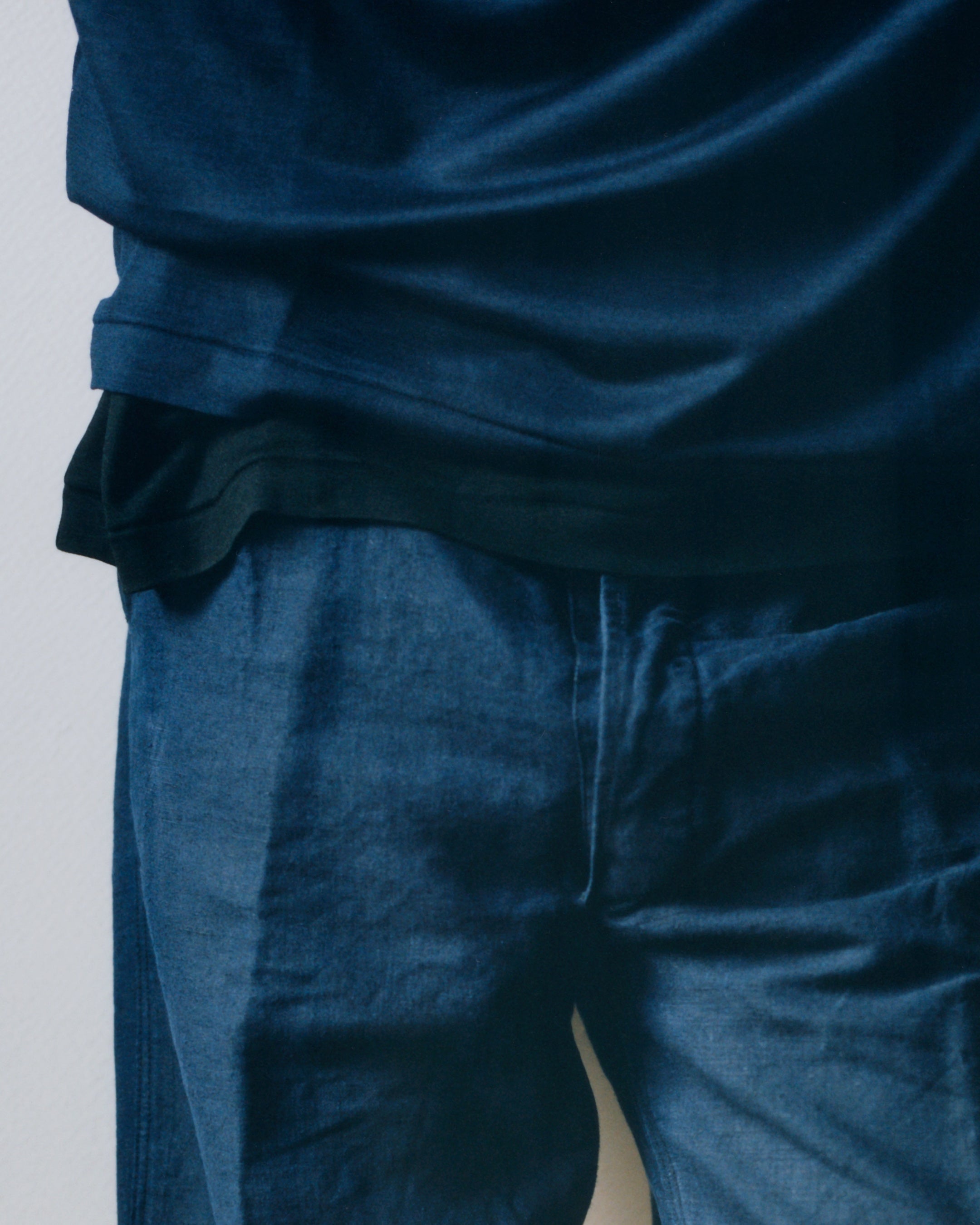 天然のINDIGOを手染めで仕上げました。白いカーフレザーを職人がハンドで染め上げており、非常に深みのある色合いに仕上がった。