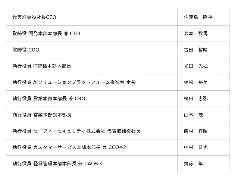 クラウド録画サービスシェアNo.1(※1)のセーフィー株式会社(東京都品川区:代表取締役社長CEO 佐渡島 隆平、以下「セーフィー」)は、2026年1月付で、経営体制強化を目的とした新たな組織体制にて始動することをお知らせいたします。2014年10月の創業以来、「映像プラットフォーム」を軸に、あらゆる業界の現場DXの推進に取り組んでまいりました。今後、さらなる事業拡大に向けて経営体制を一層強化するため、新組織体制では、これまでCFOを務めた古田がCOO(Chief Operating Officer)に就任し、財務戦略と事業運営を直結させ、持続的な成長戦略の実行を牽引してまいります。また、グループ企業の増加・拡大に伴う組織基盤の強化、および営業活動の戦略構築・推進を加速させるため、新たに3名の執行役員を選任いたしました。