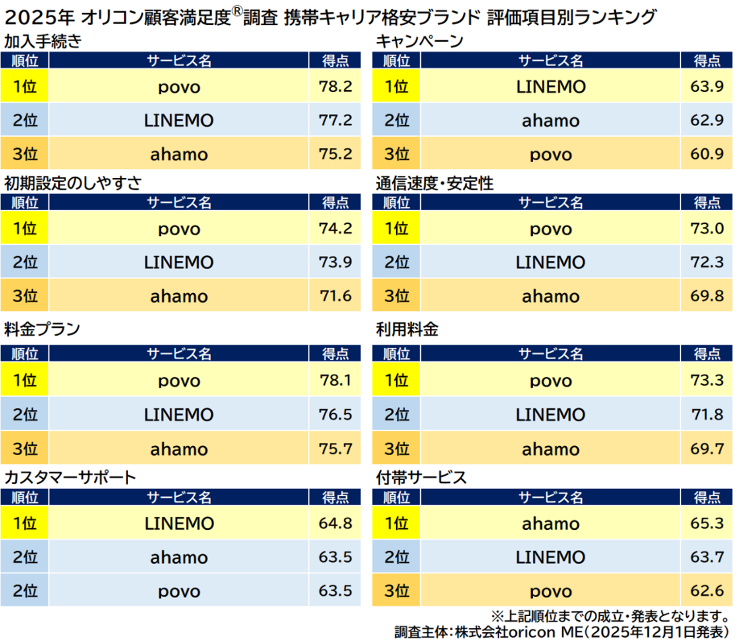 オリコン株式会社(本社:東京都港区 代表取締役社長:小池 恒、略称:オリコン)は、グループ会社である株式会社oricon MEが、実際のサービス利用者を対象に第三者の立場で実施した『携帯キャリア格安ブランド』の顧客満足度調査の結果を、2025年12月1日(月)14時に「オリコン顧客満足度(R)」公式サイト内にて発表いたしました。