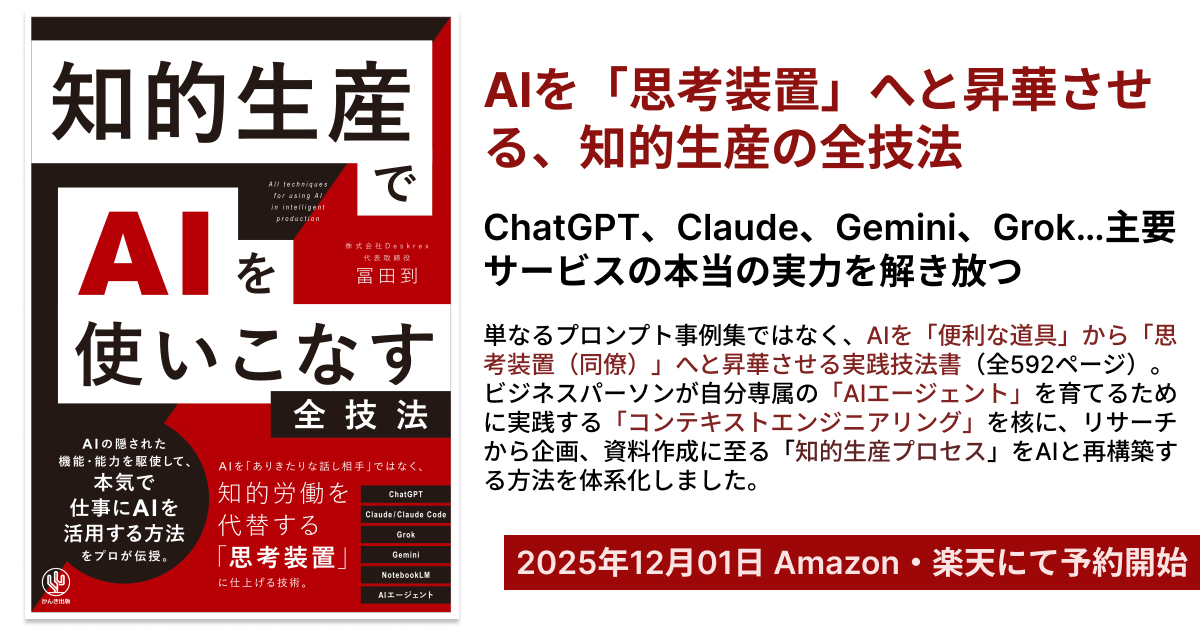 株式会社Deskrex(本社:東京都渋谷区神泉町10番15号 アネックス神泉301、以下「Deskrex」)の、代表取締役CEOの冨田到、は、生成AIとAIエージェントを知的生産のあらゆる場面で使いこなす実践書『知的生産でAIを使いこなす全技法』を、株式会社かんき出版より2025年12月17日に発売いたします。
