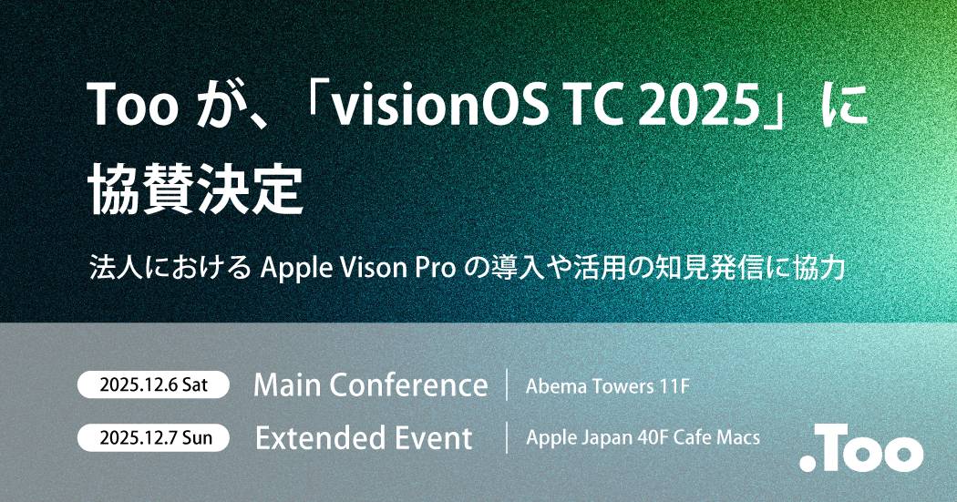 クリエイティブ市場の総合商社・株式会社Too(本社/東京都港区虎ノ門3-4-7、社長/石井剛太、以下Too)は、このたび2025年12月6日(土)- 7日(日)に開催される「visionOS TC 2025」の趣旨に賛同し、協賛することをお知らせします。