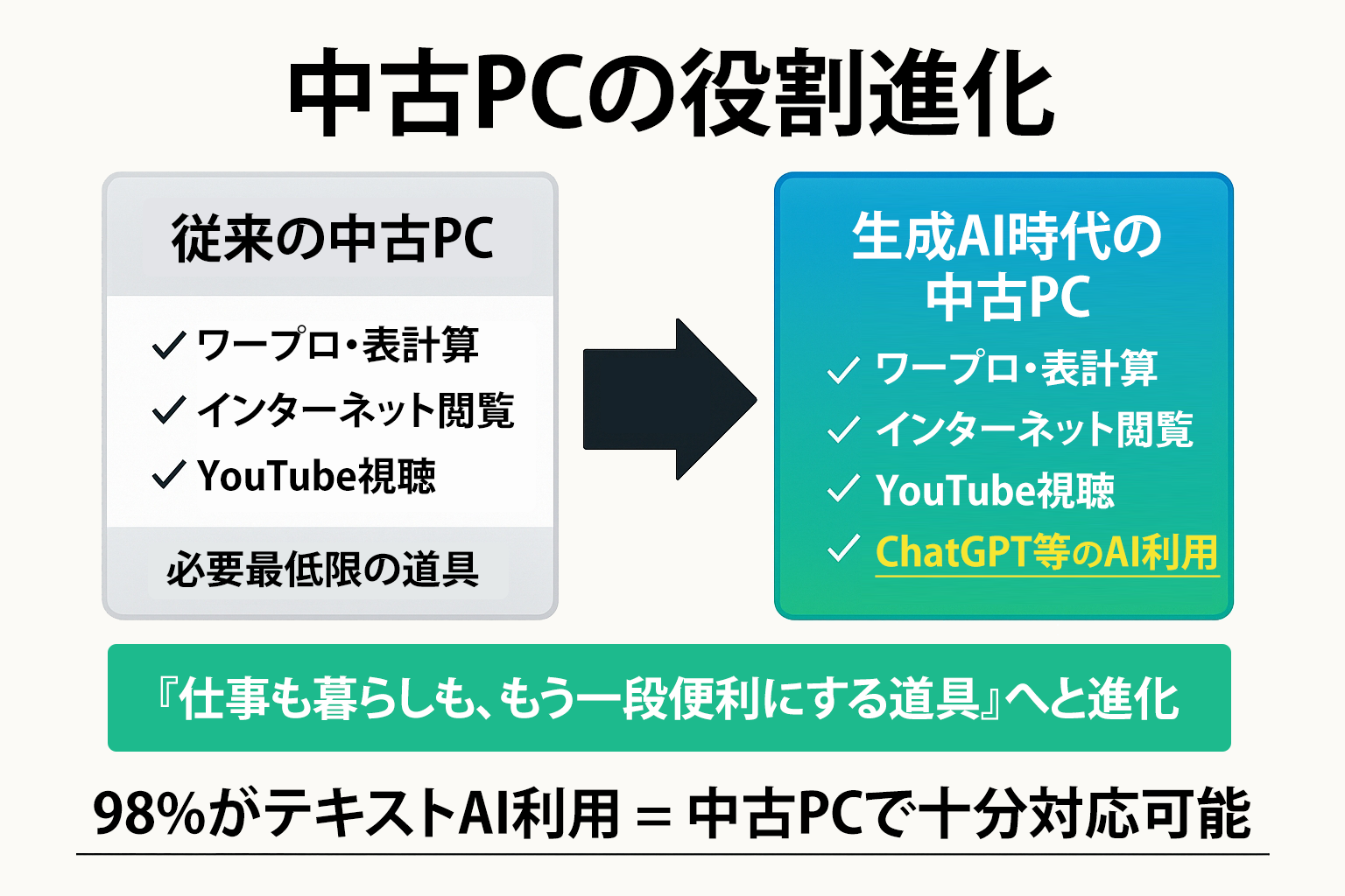 一方で、今回の調査では、生成AI利用者の約98%がテキスト生成AIを中心に利用していることが分かっています。これらの多くはブラウザで動くクラウド型サービスであり、ワープロやWeb閲覧ができる一般的な中古PCでも十分に対応可能です。
