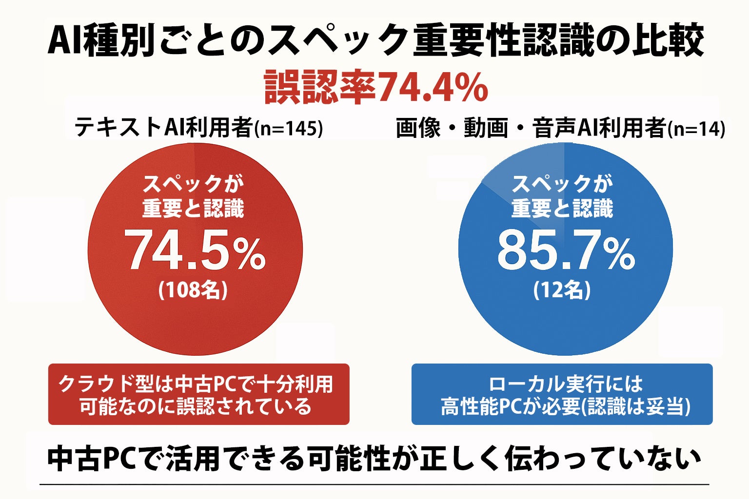 一方で、本来は一般的な中古PCでも十分に利用可能にもかかわらず、テキストAI利用者の約4人に3人が「高スペックが必要」と認識しており、中古PCでも活用できる可能性が正しく伝わっていない現状が浮かび上がりました。