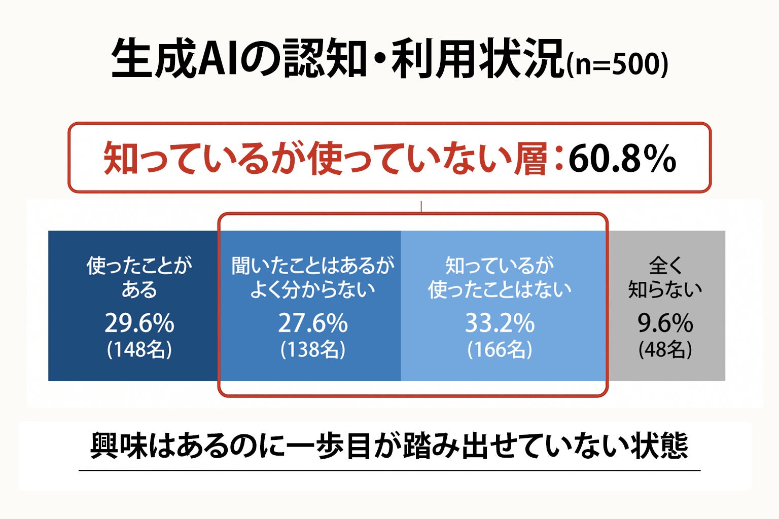 生成AIを知っていても使っていない層は60.8%生成AIを「知っているが、よくわからない・使ったことはない」と回答した人は全体の60.8%にのぼり、実際の利用が進んでいないギャップが明らかになった。