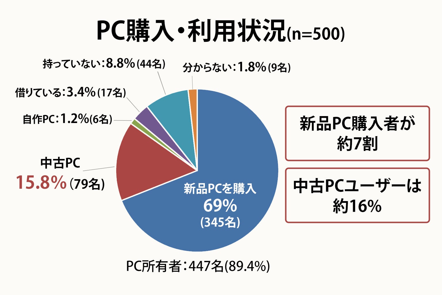 中古PC自体の壁もあわせてPCの購入・利用状況を見ると、新品PC購入者が69.0%(345名)と約7割を占める一方、中古PCユーザーは15.8%(79名)にとどまっており、選択肢としての中古PCへの理解自体も進んでいないようです。