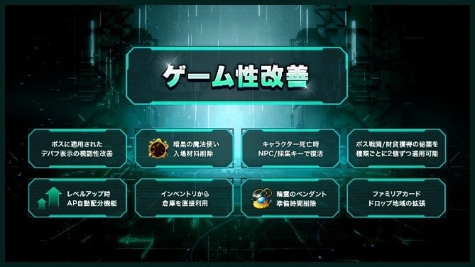 職業別ストーリークエストのスキップ機能や、バフをボタン一つで使用できるバフシーケンスの追加、ファミリアカードドロップ地域の拡張、ボス入場時のスキルクールタイムの初期化など様々なゲーム内コンテンツのアップデートを実施予定です。